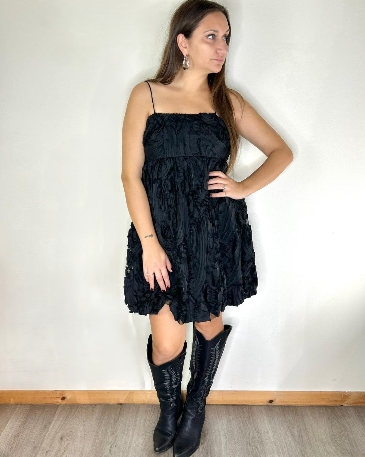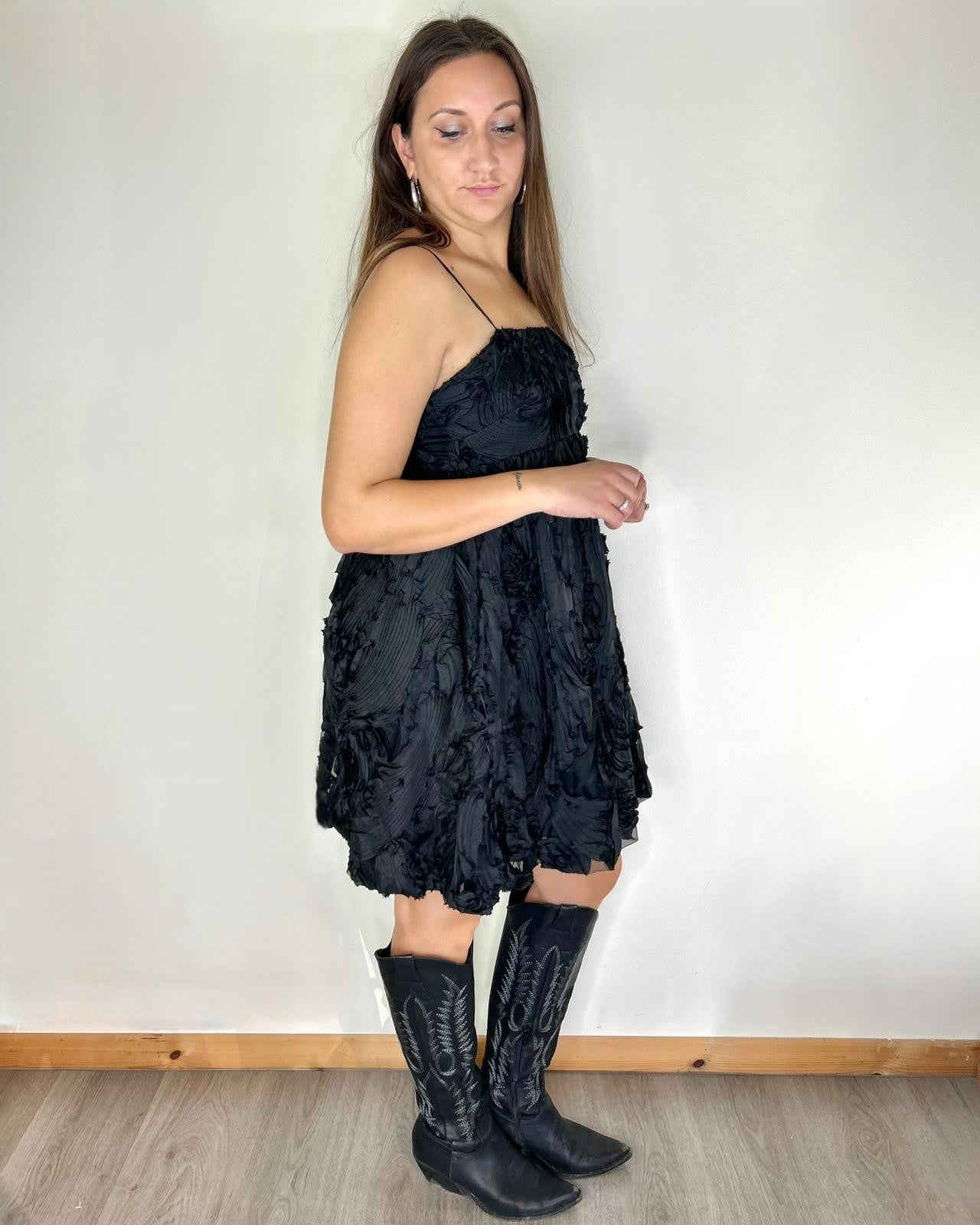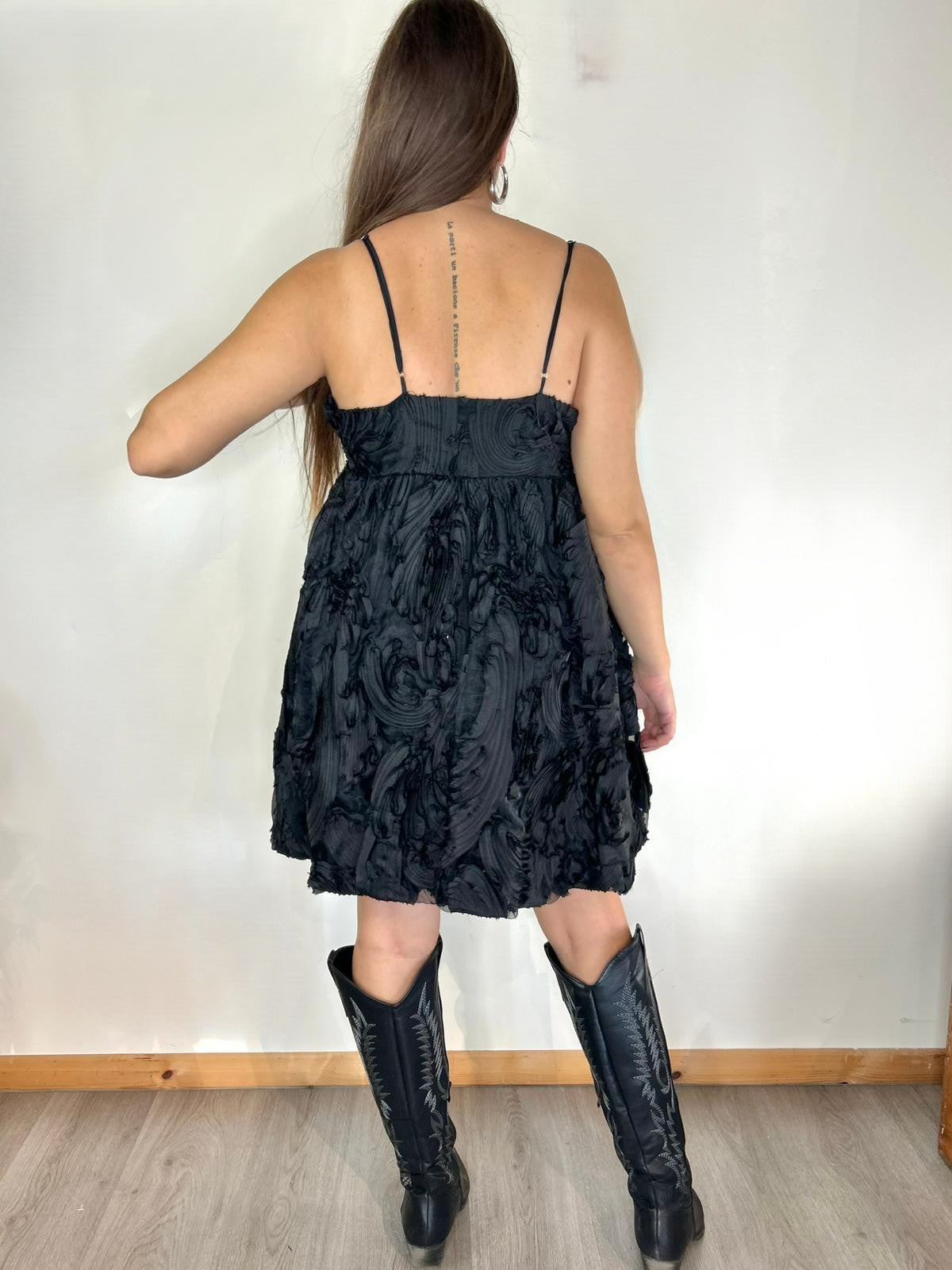 Mini abito a palloncino impreziosito da ricami floreali in rilievo.