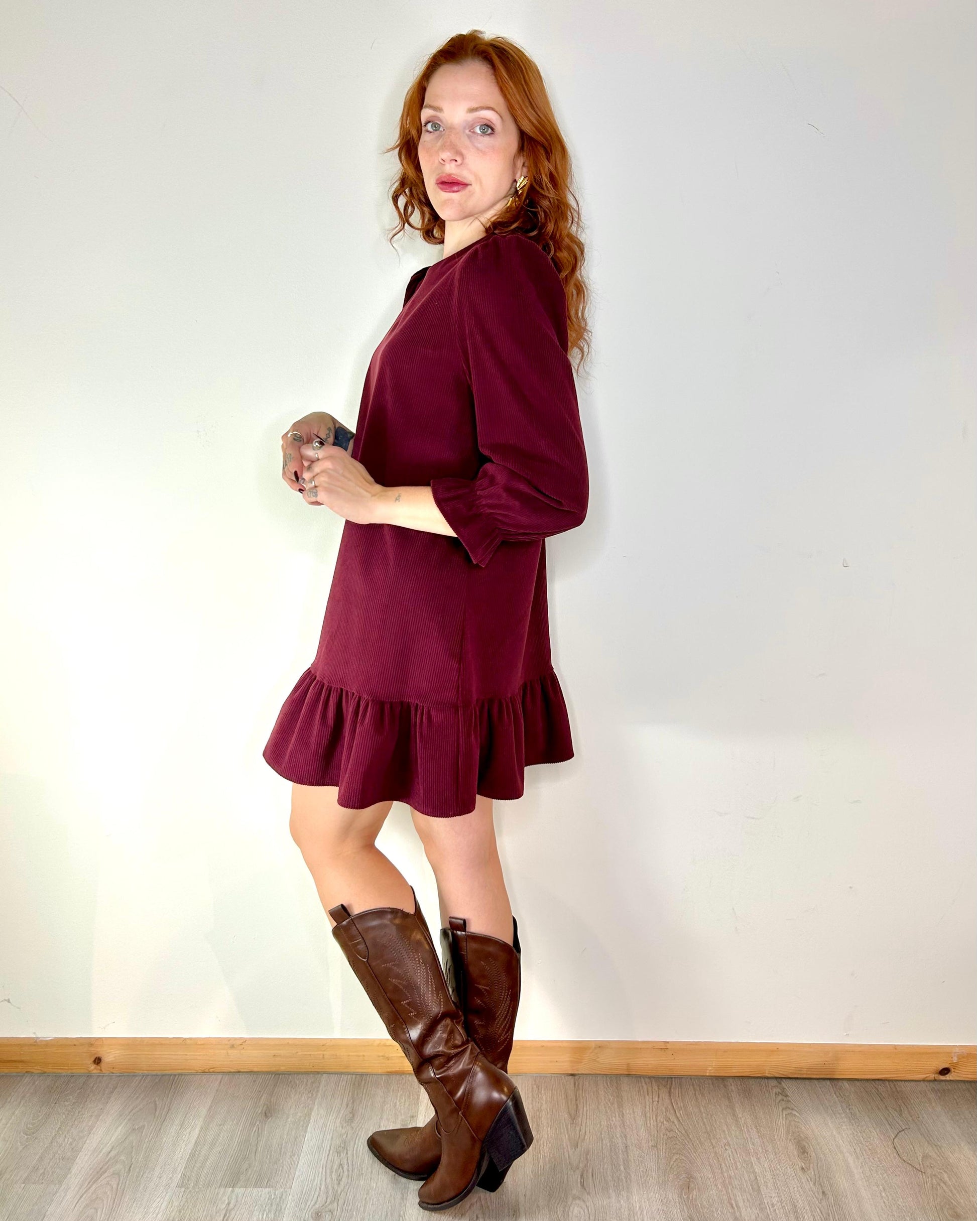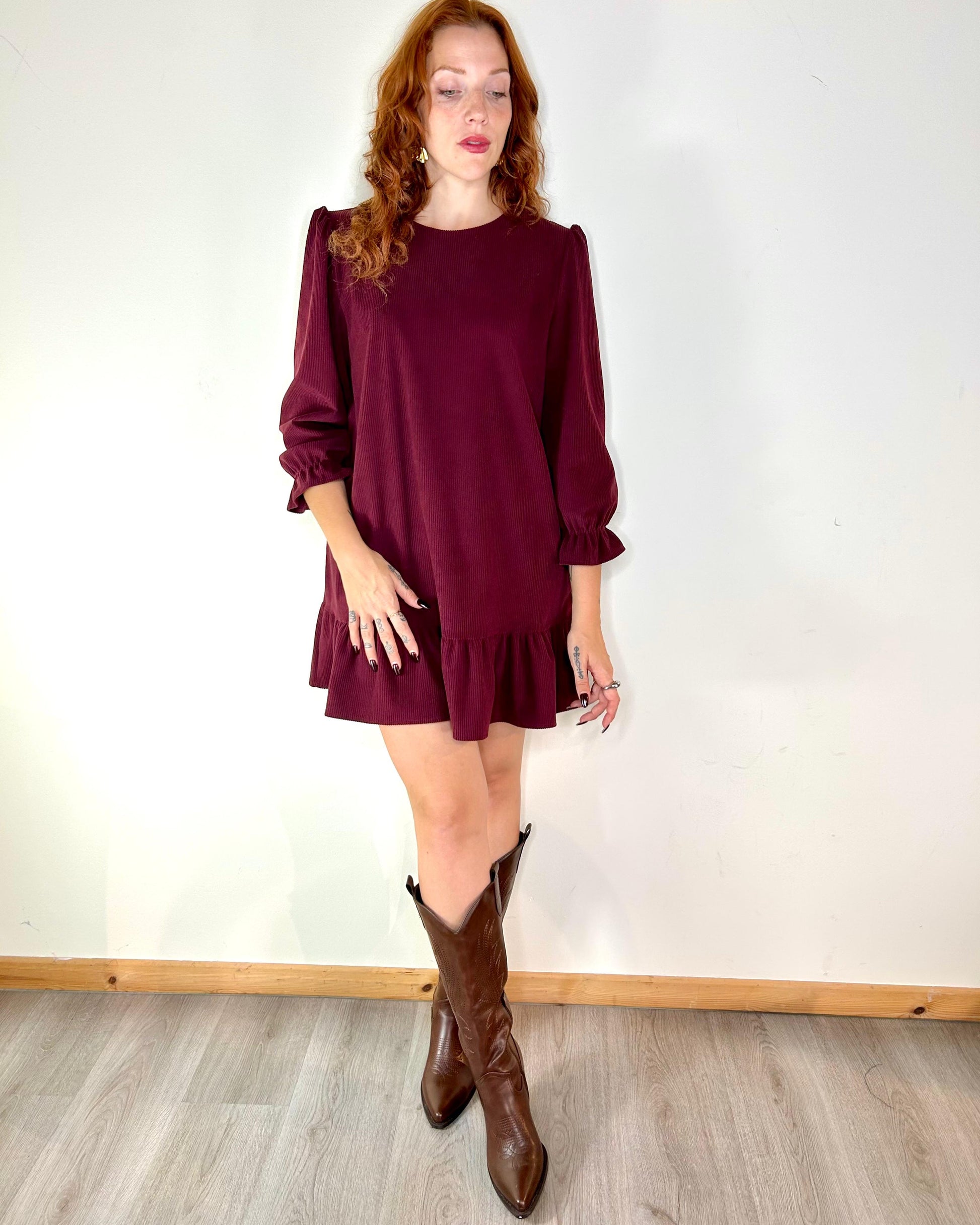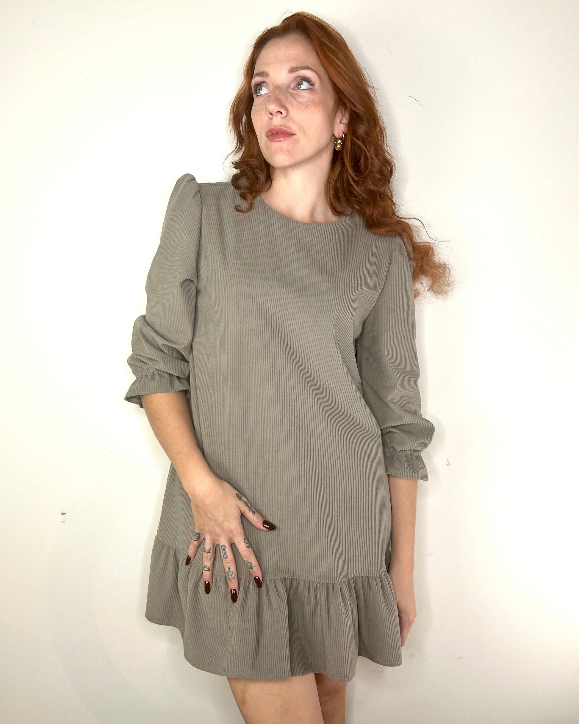 Abito in morbido velluto effetto ciniglia a coste. Arricciatura che crea un volant sia sul polsino che sull'orlo della parte inferiore. Questi dettagli consentono di utilizzare questo abitino anche come gonna ad esempio con un maglioncino sopra e poi una cintura (volendo) a segnare il punto vita. Molto bello anche con un maglione effetto gilet maxi. Provare per credere e se non vuoi provare segui i nostri consigli e idee look sui social!!