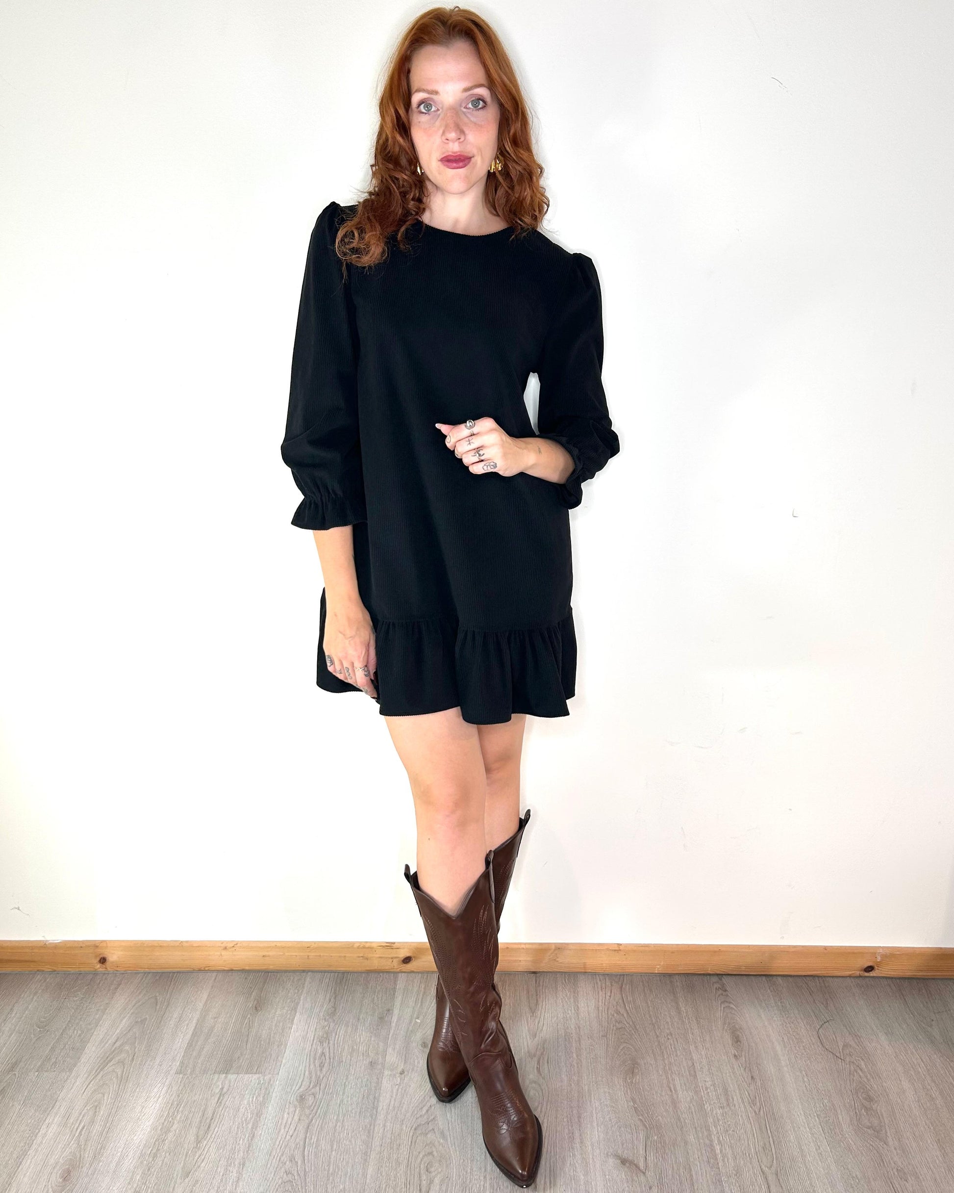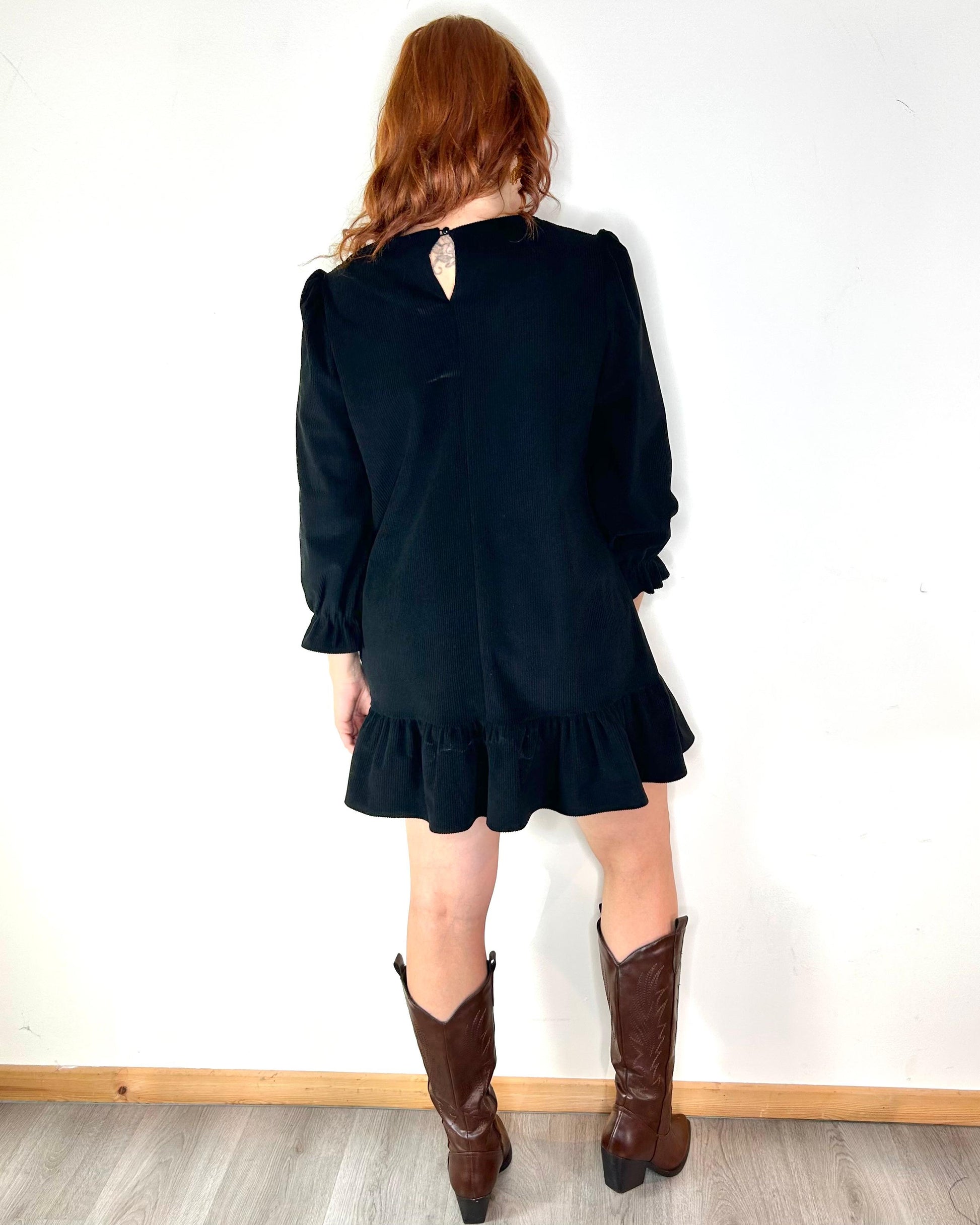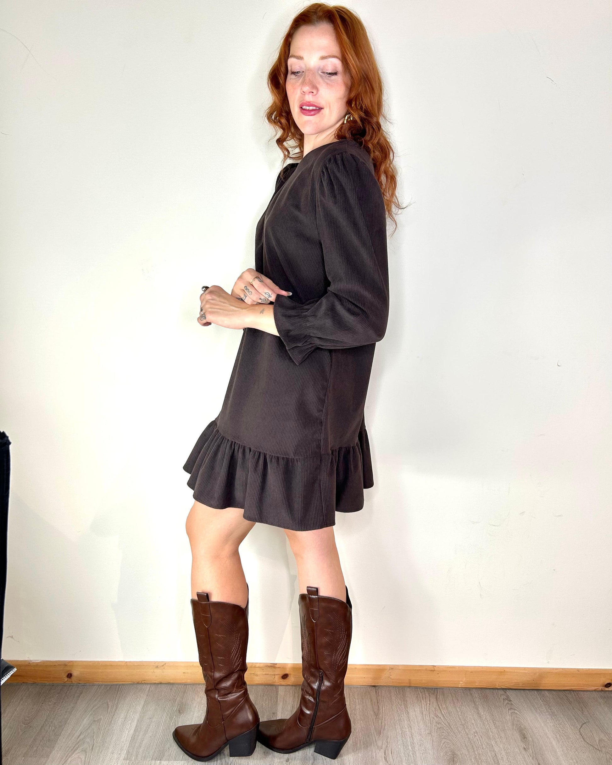 Abito in morbido velluto effetto ciniglia a coste. Arricciatura che crea un volant sia sul polsino che sull'orlo della parte inferiore. Questi dettagli consentono di utilizzare questo abitino anche come gonna ad esempio con un maglioncino sopra e poi una cintura (volendo) a segnare il punto vita. Molto bello anche con un maglione effetto gilet maxi. Provare per credere e se non vuoi provare segui i nostri consigli e idee look sui social!!