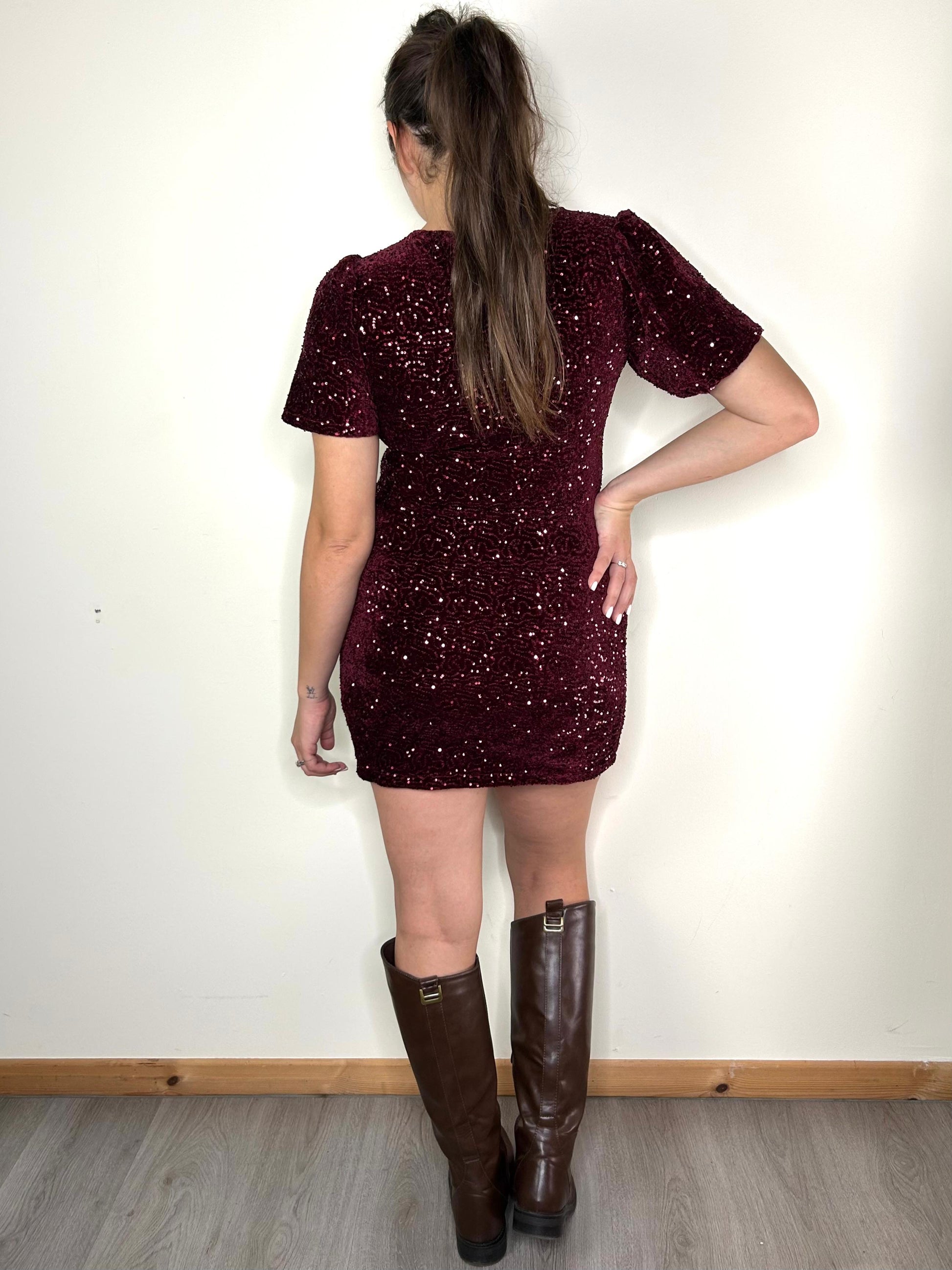 Abito midi con base ciniglia e impreziosito da pailettes color bordeaux. Misura da sopra ginocchio, manica corta che rimane larga con sbuffo sulla spalla. Sottoveste in misto viscosa per proteggersi dal pizzicore delle pailettes.