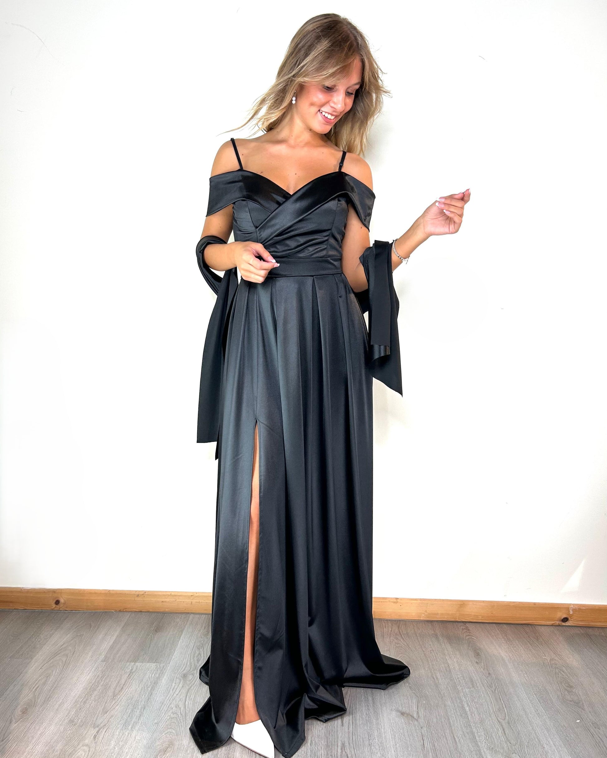 Abito da cerimonia, tessuto lucido, stile impero quindi perfetto per valorizzare il punto vita.