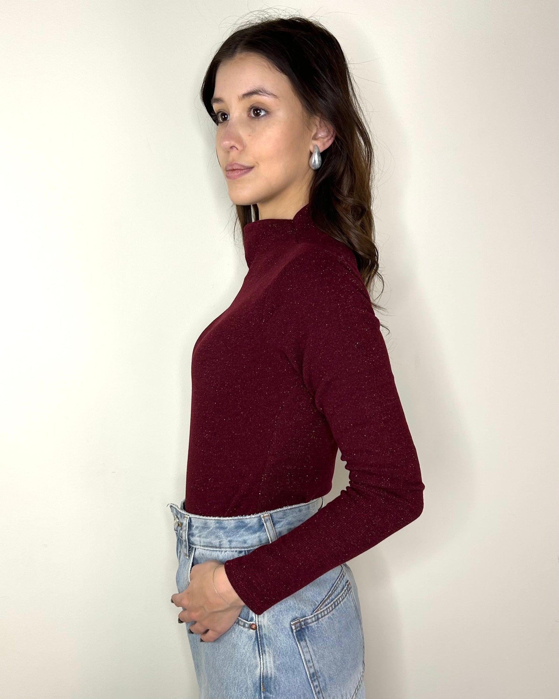 Body in maglia morbida a costine con filo lurex e collo a lupetto. Veste molto aderente, non oltre la taglia 44, un effetto wow anche sul look più basic!