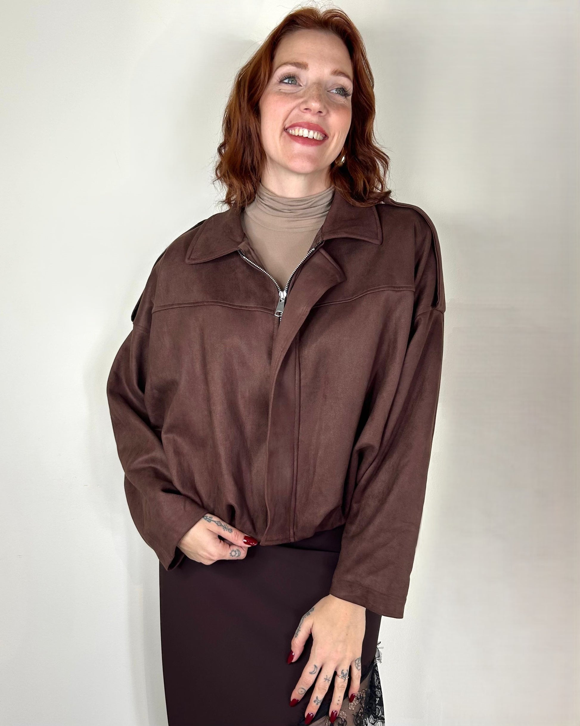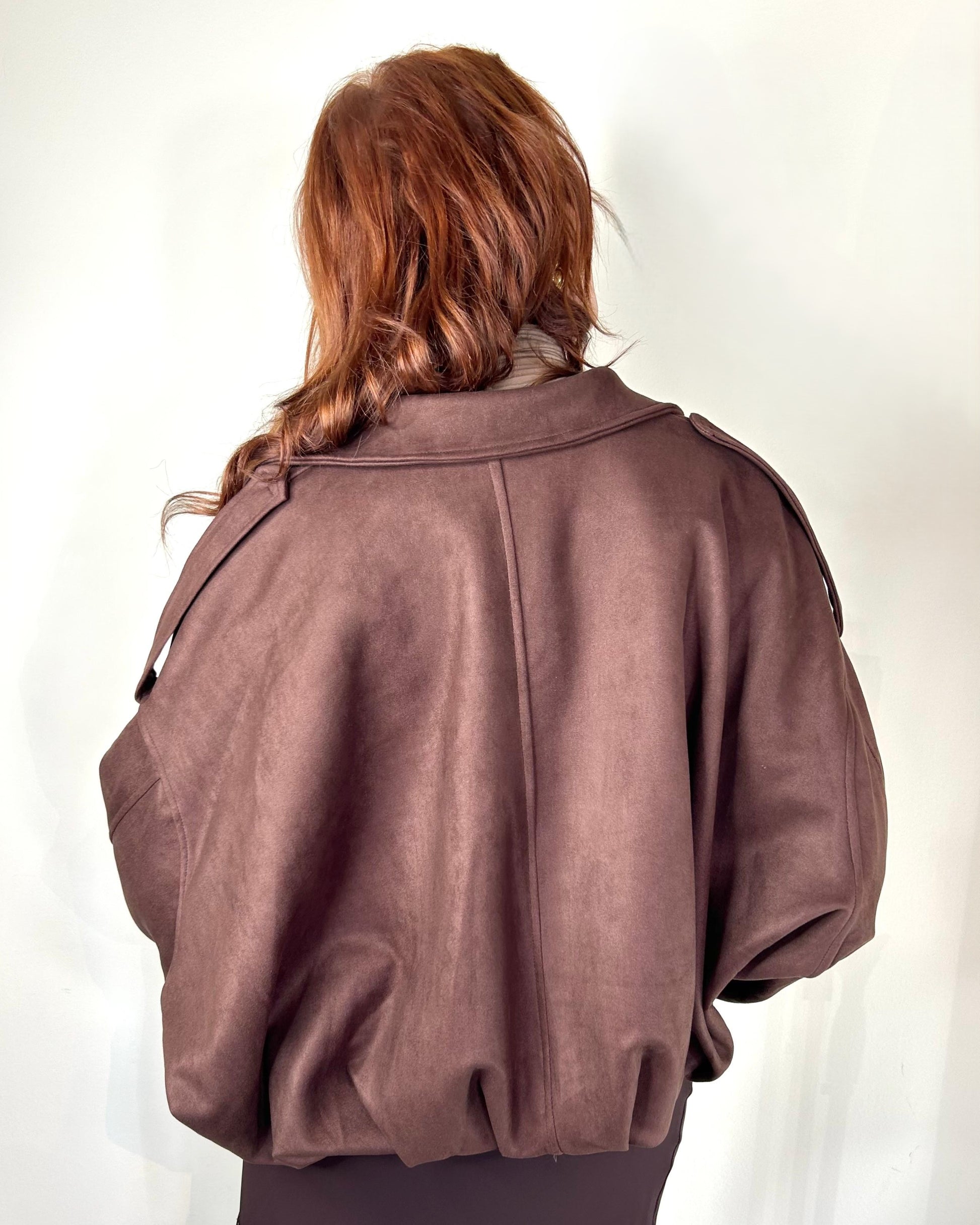 Bomber in suede marrone scuro, modello a palloncino con maniche larghe a pipistrello.