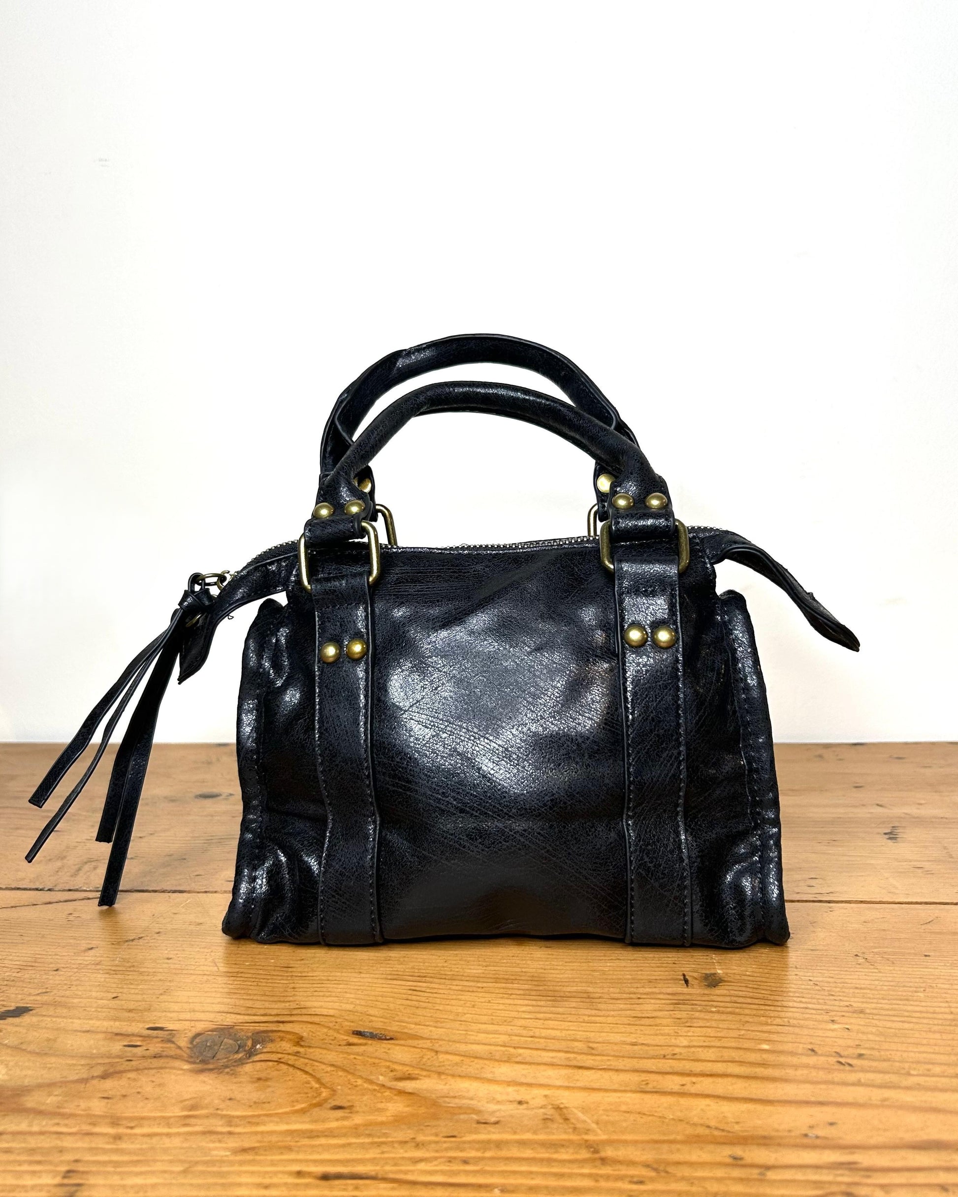 Borsetta in ecopelle effetto invecchiato con borchie e manici per portarla a mano. Viene venduta con tracolla regolabile coordinata per portarla a spalla o a tracolla.