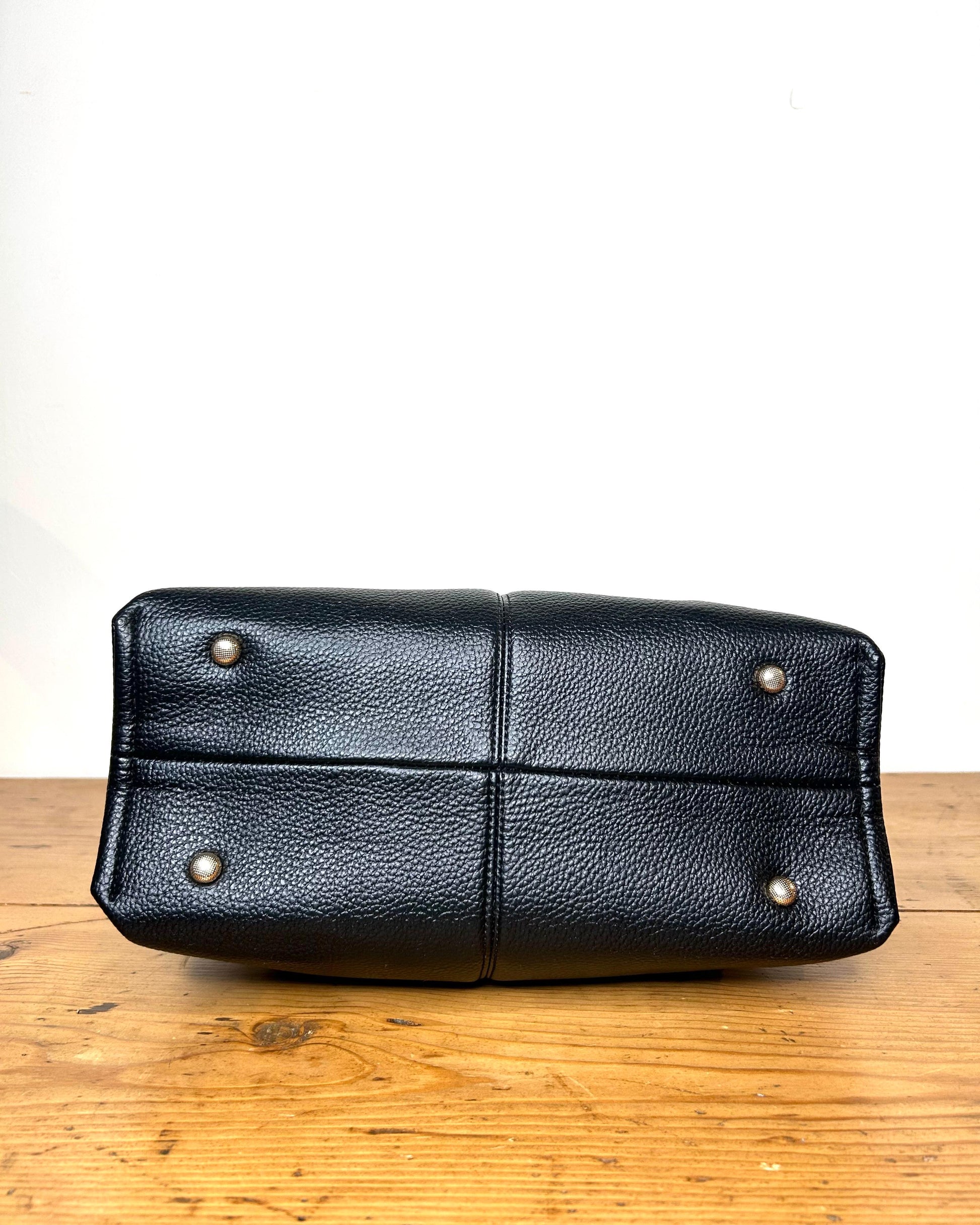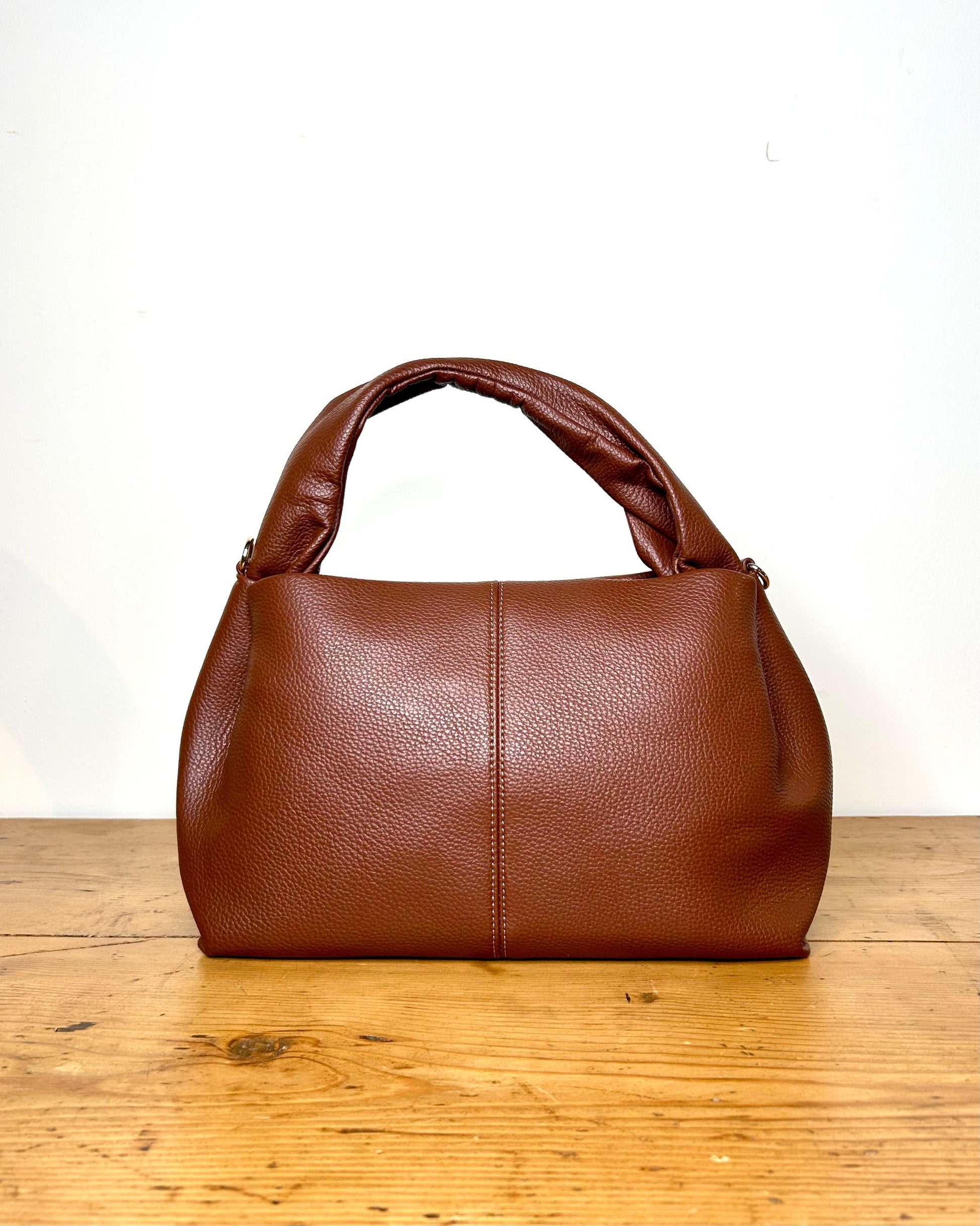 Borsa in ecopelle effetto pasticcino, molto morbida con manica per portarla a mano. Viene venduta con tracolla regolabile coordinata per portarla a spalla o a tracolla.