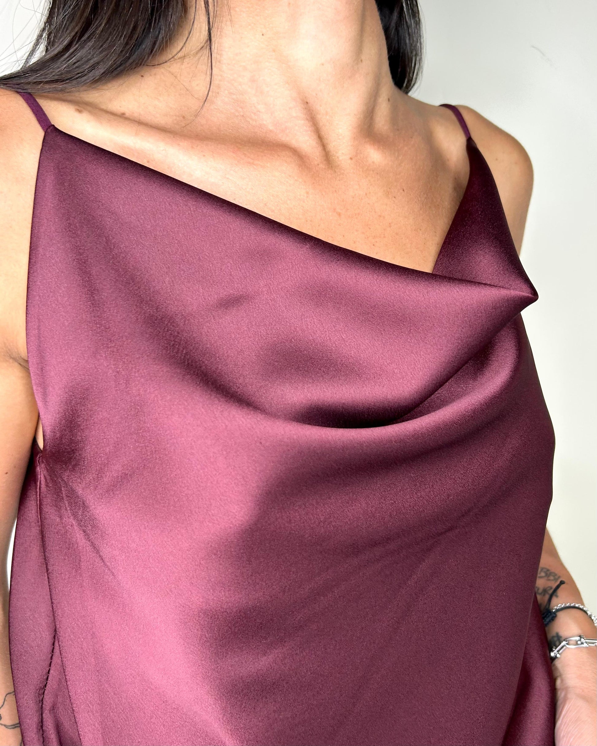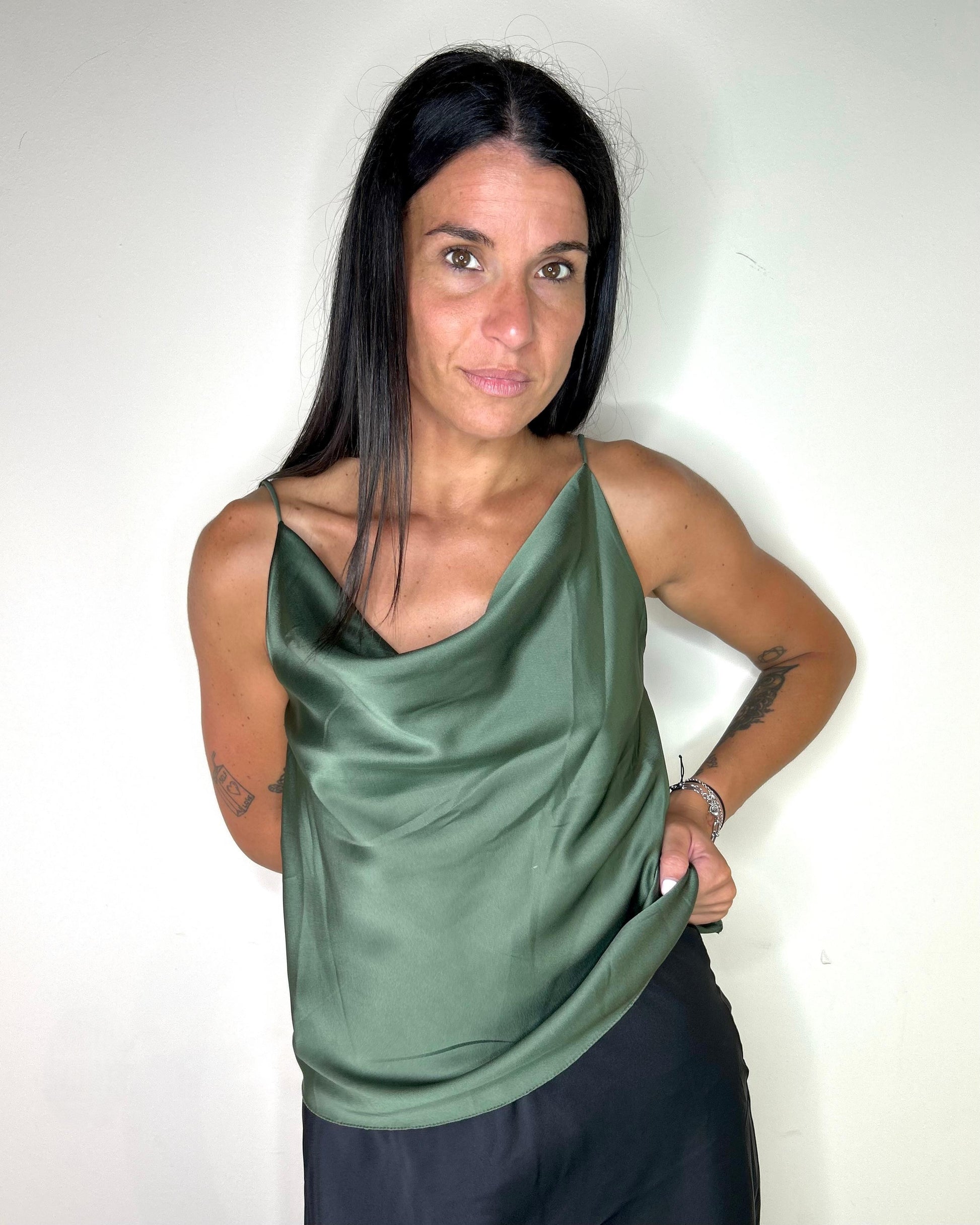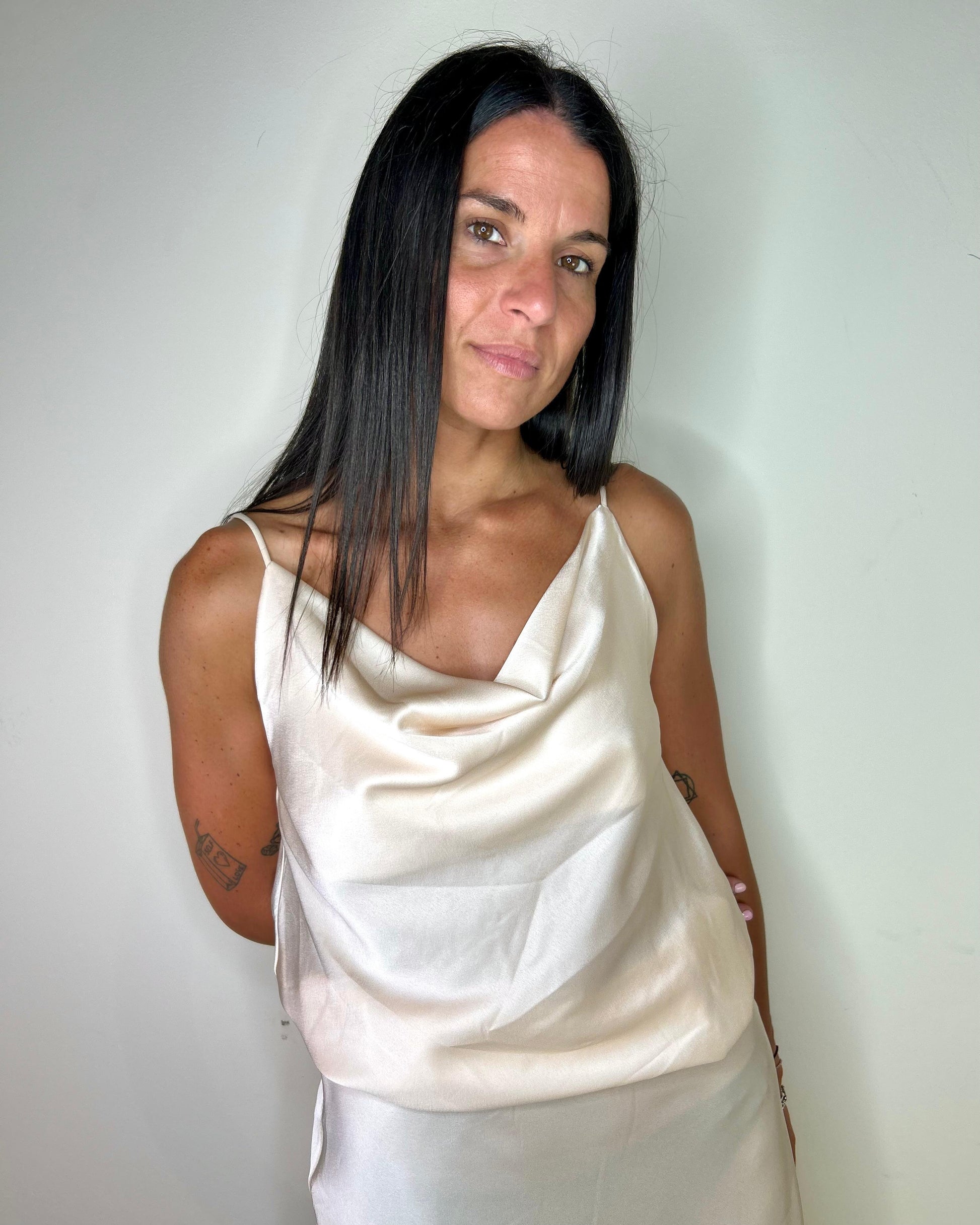 Canotta in raso con spallina fine e scollo morbido con drappeggio sia davanti che dietro. Il color nero e il beige sono perfettamente abbinabili alla gonna Michela.