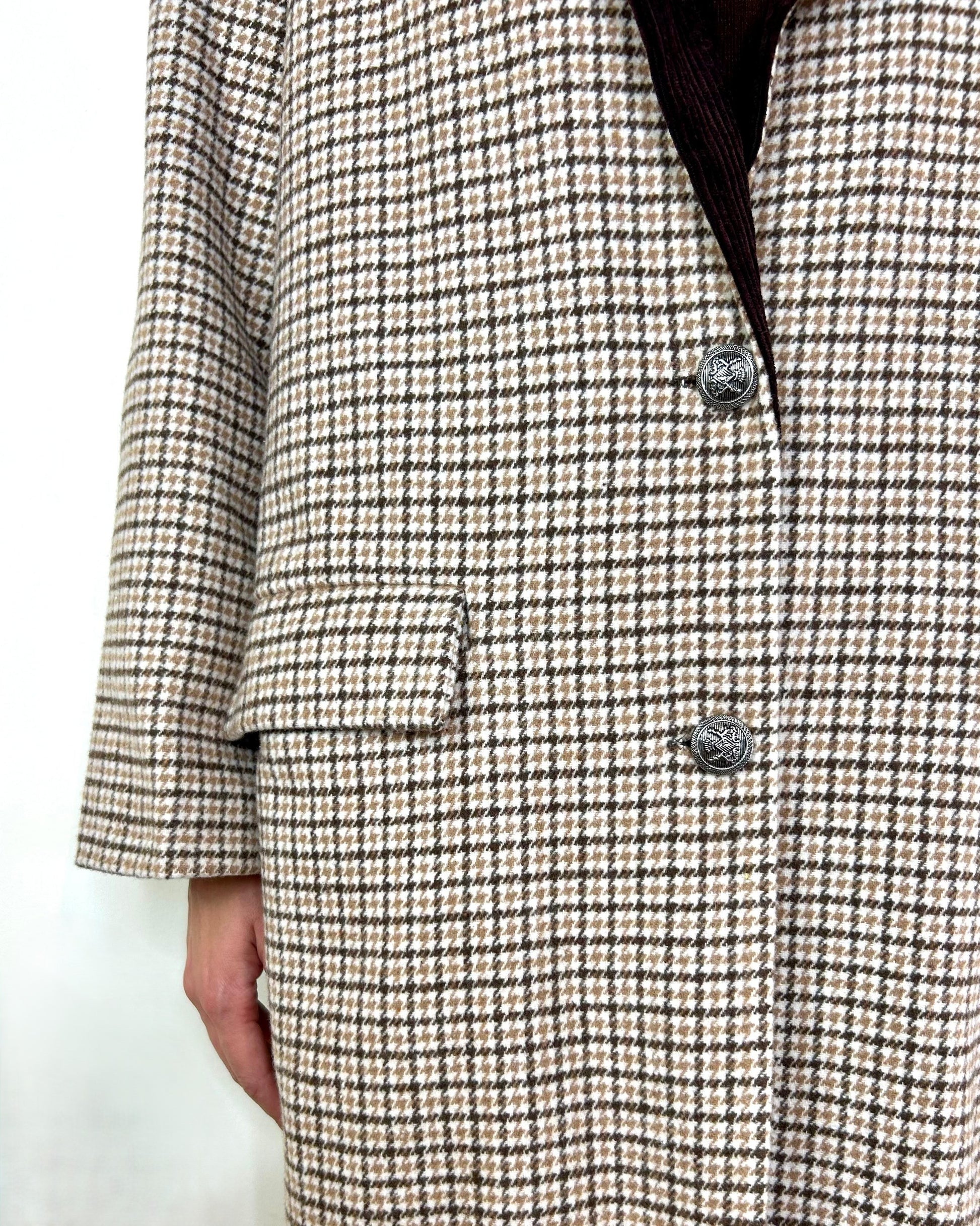 Cappotto in panno con fodera interna, colletto a contrasto in velluto marrone.