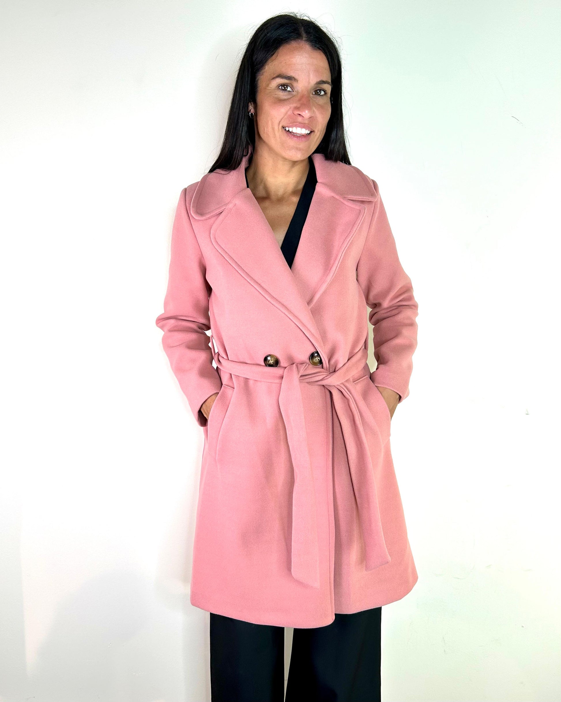 Cappotto color rosa con cintura in vita. Ampio collo e fodera interna.