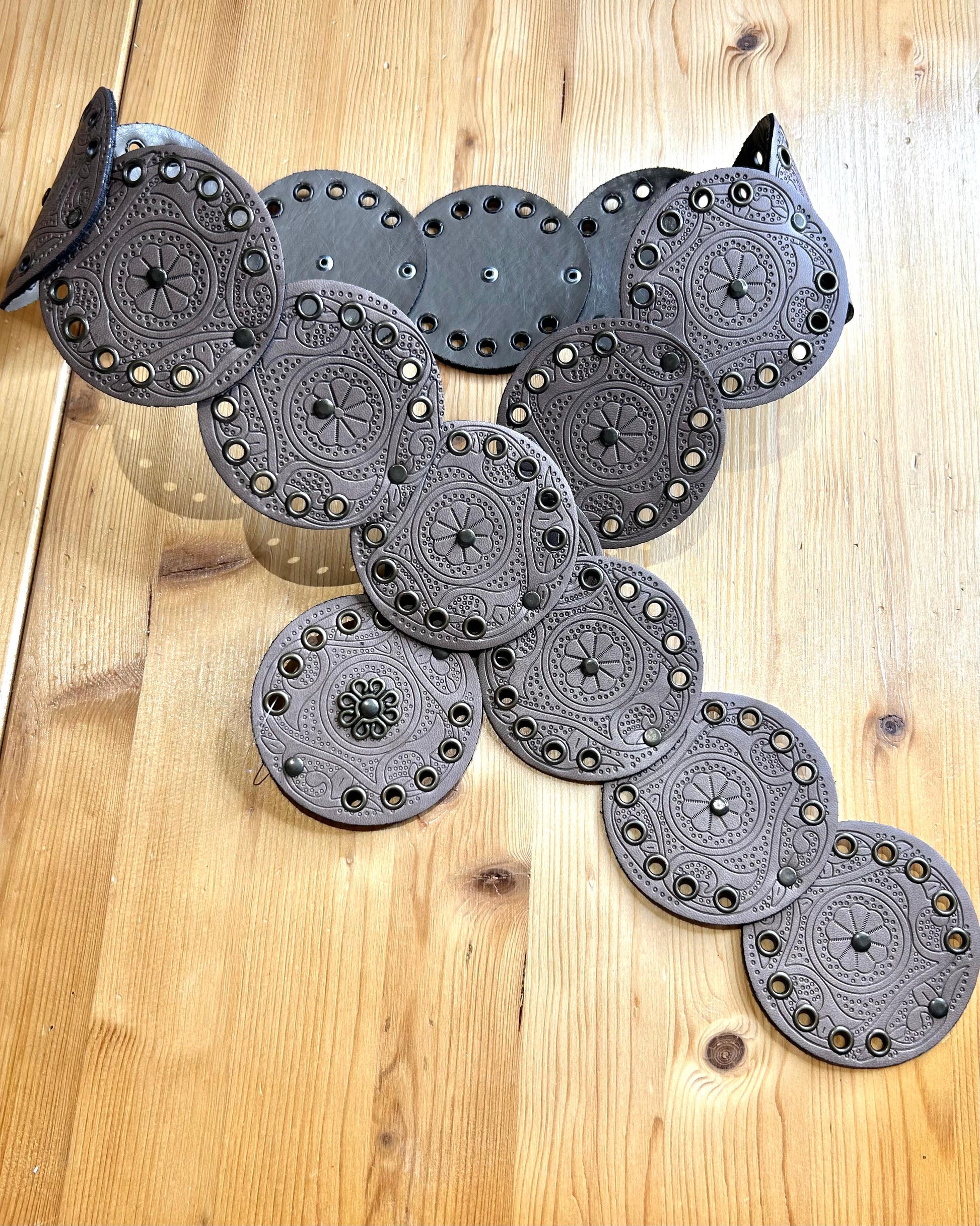 Cintura con ciondoli e borchie, lunga 111cm, si può chiudere in uno dei qualsiasi fori dei ciondoli. disponibile in due colori.