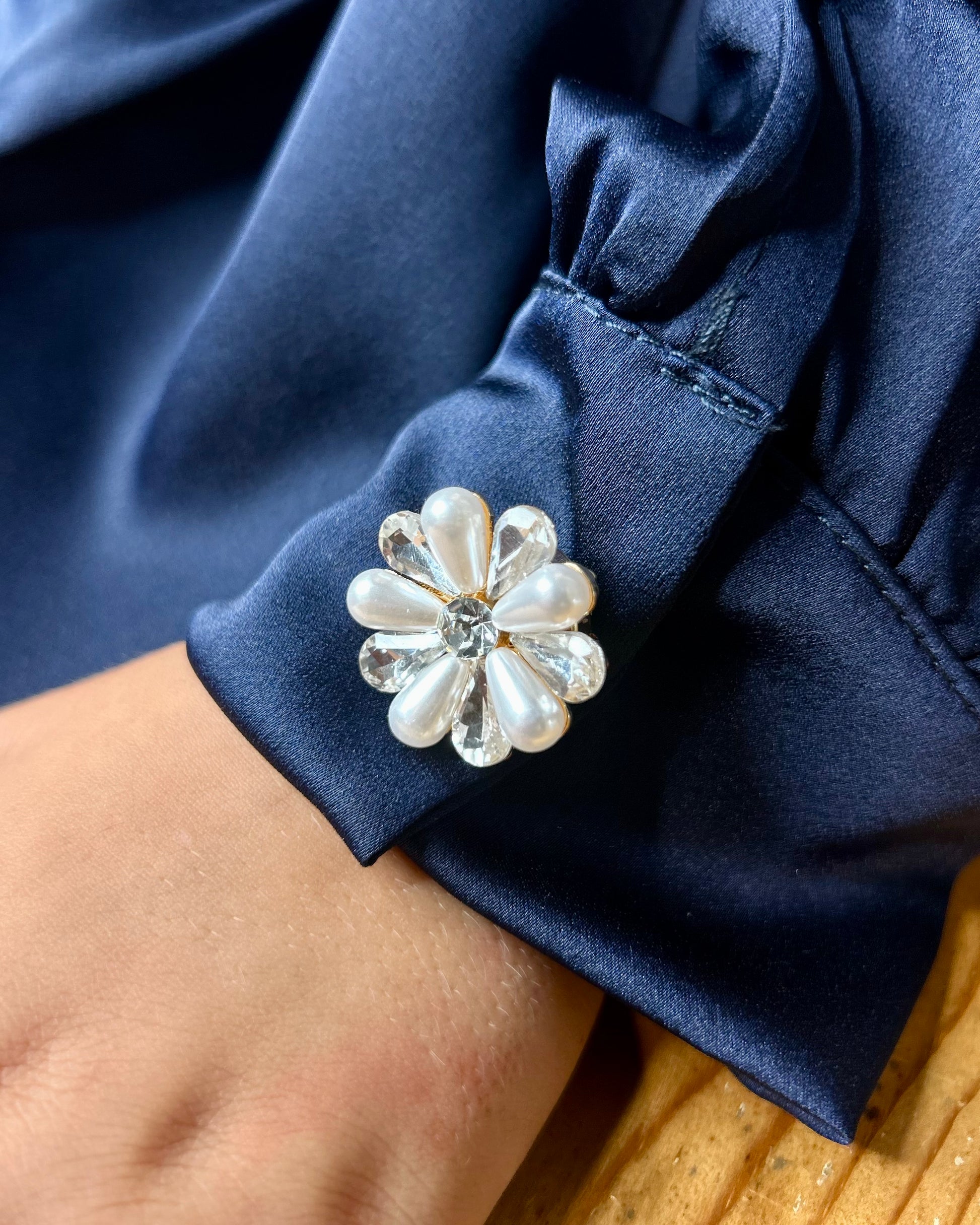 Copri bottone in acciaio con punti luce in plastica incastonate. Forma un fiore dal diametro di 2,5cm, misura massimo del bottone su cui applicarlo 1,3cm.