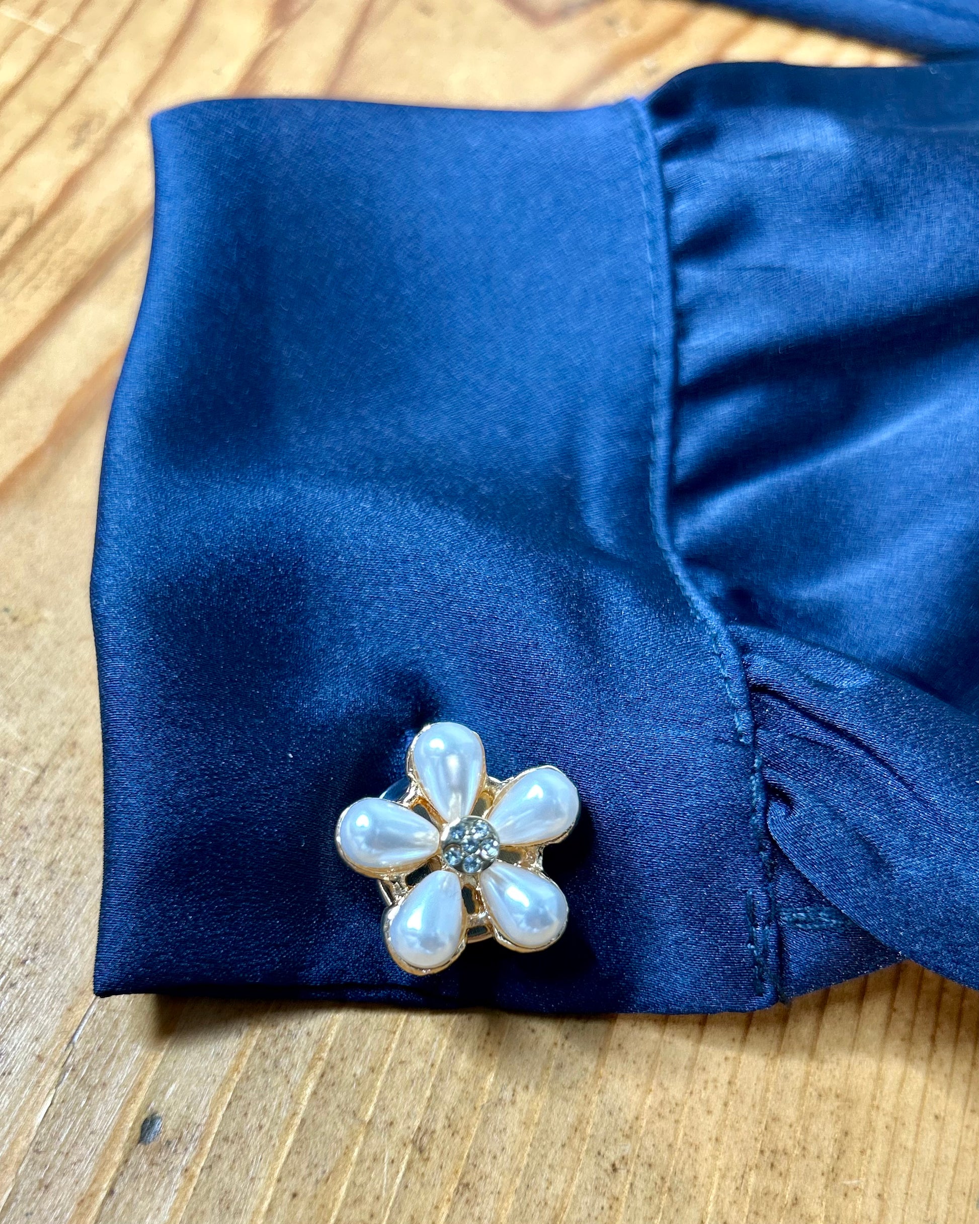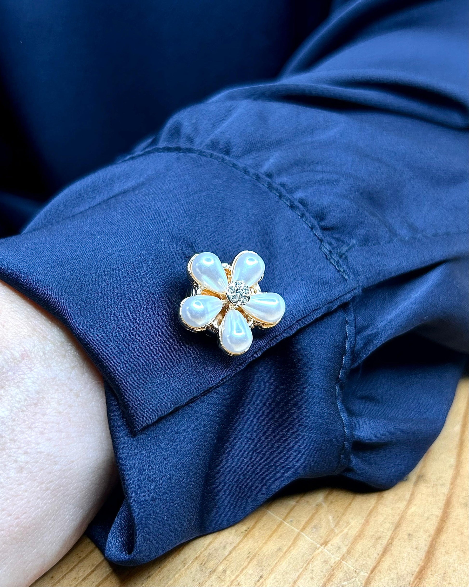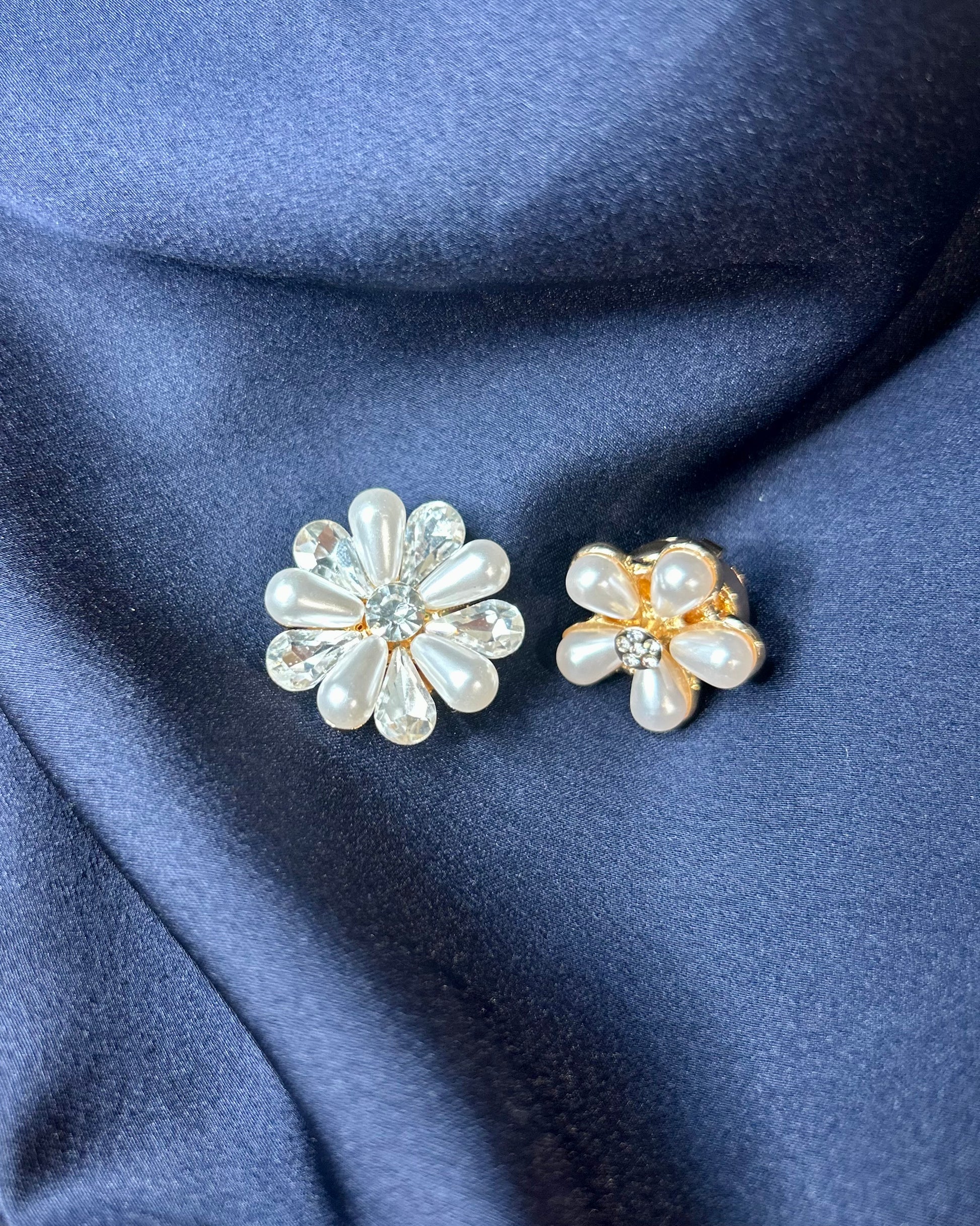 Copri bottone in acciaio con perle in plastica incastonate. Forma un fiore dal diametro di 2cm, misura massimo del bottone su cui applicarlo 1,2cm.