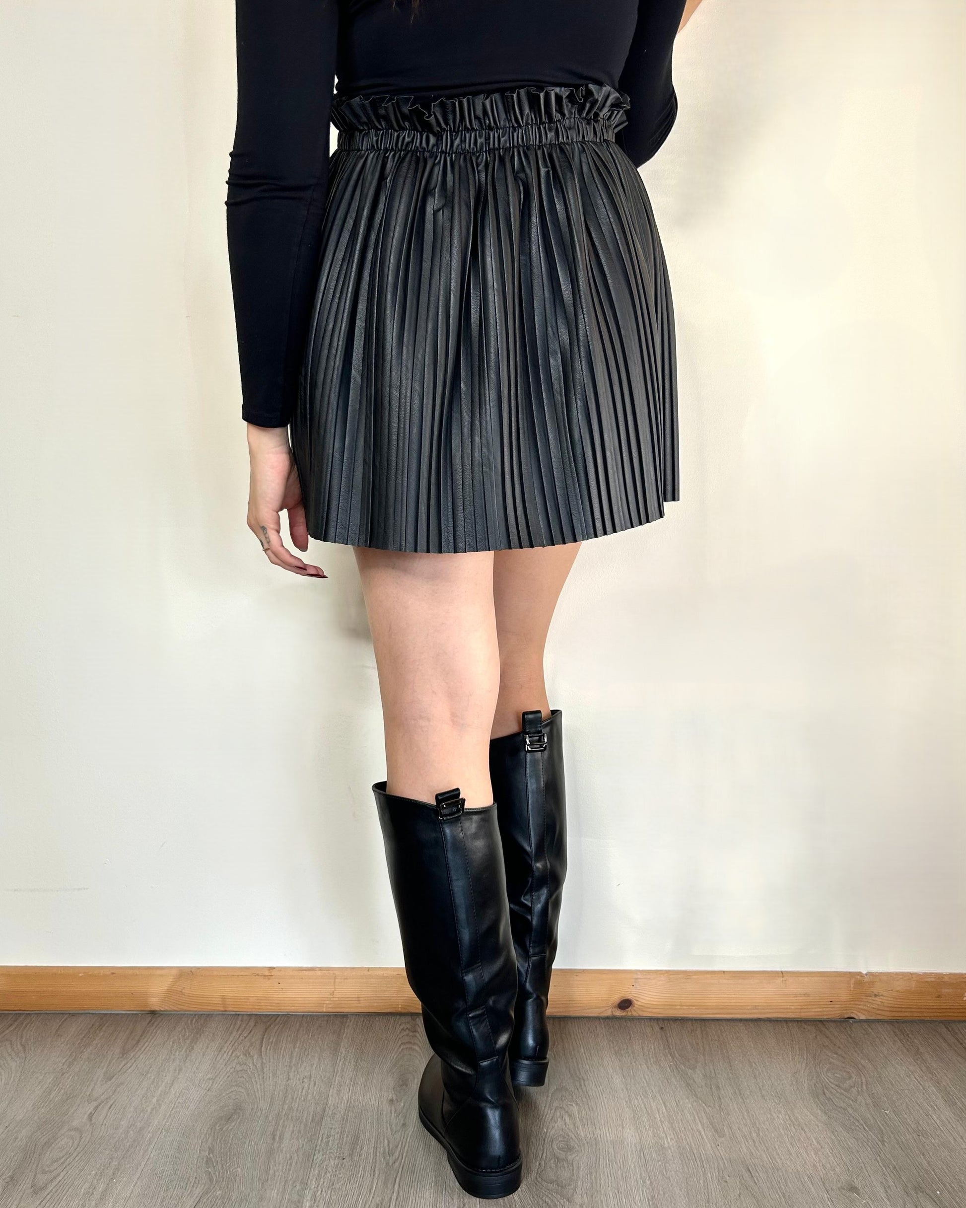 Gonna corta in ecopelle plissettata, elastico in vita. Elastico davvero molto morbido, arriva alla taglia 48-50.