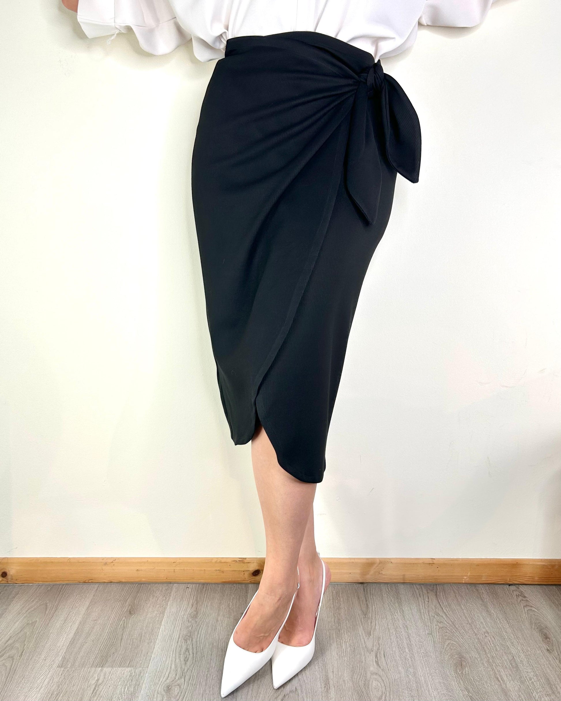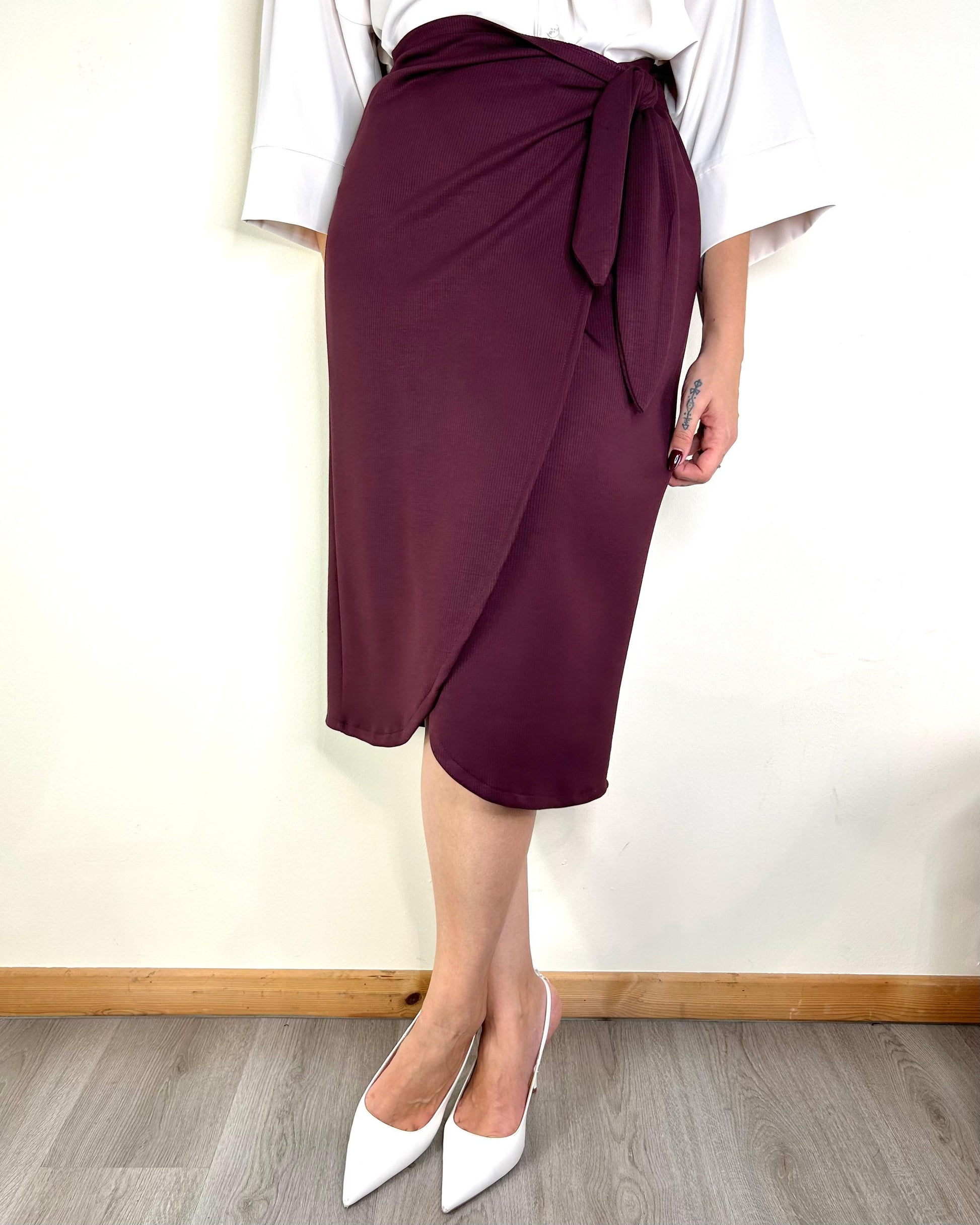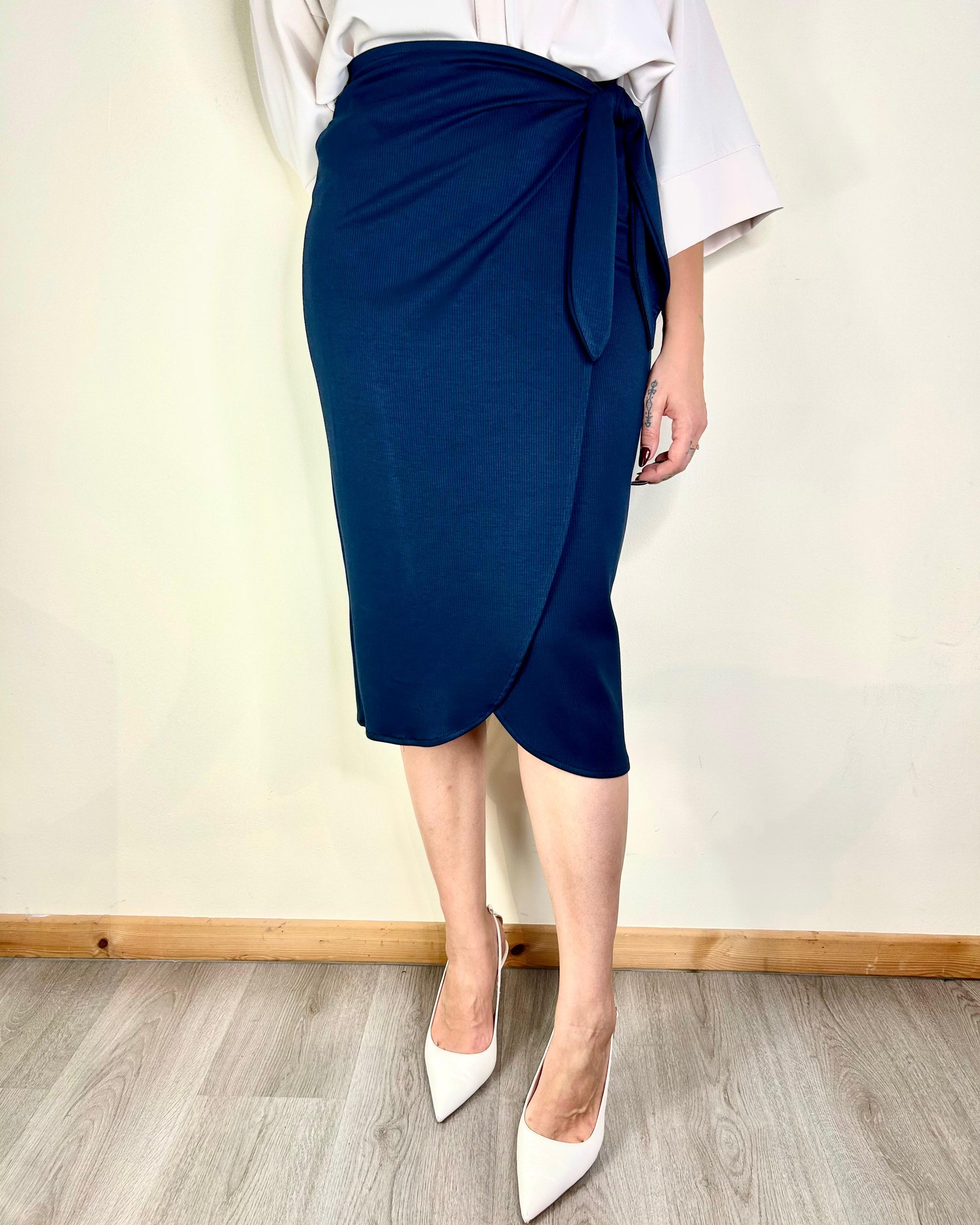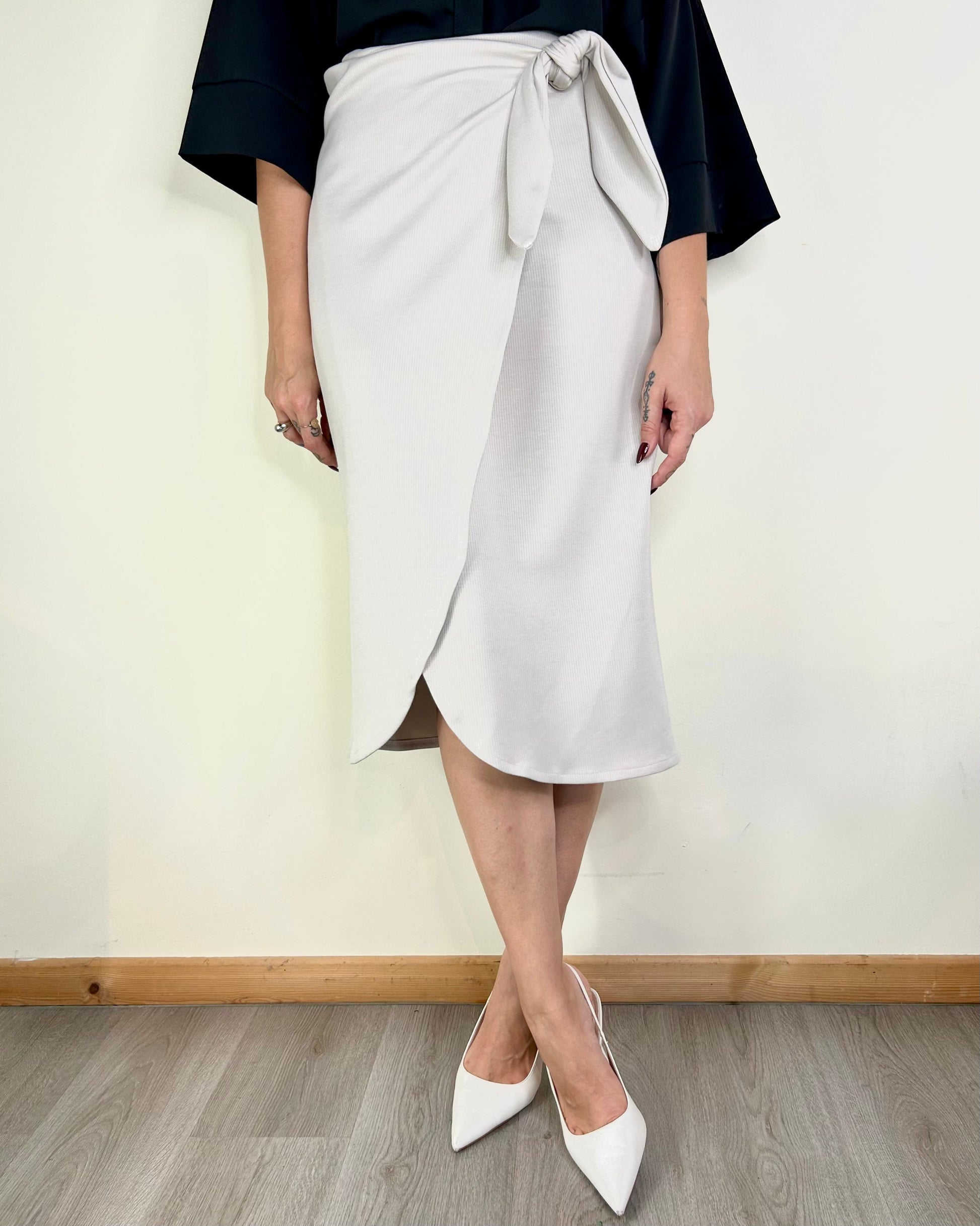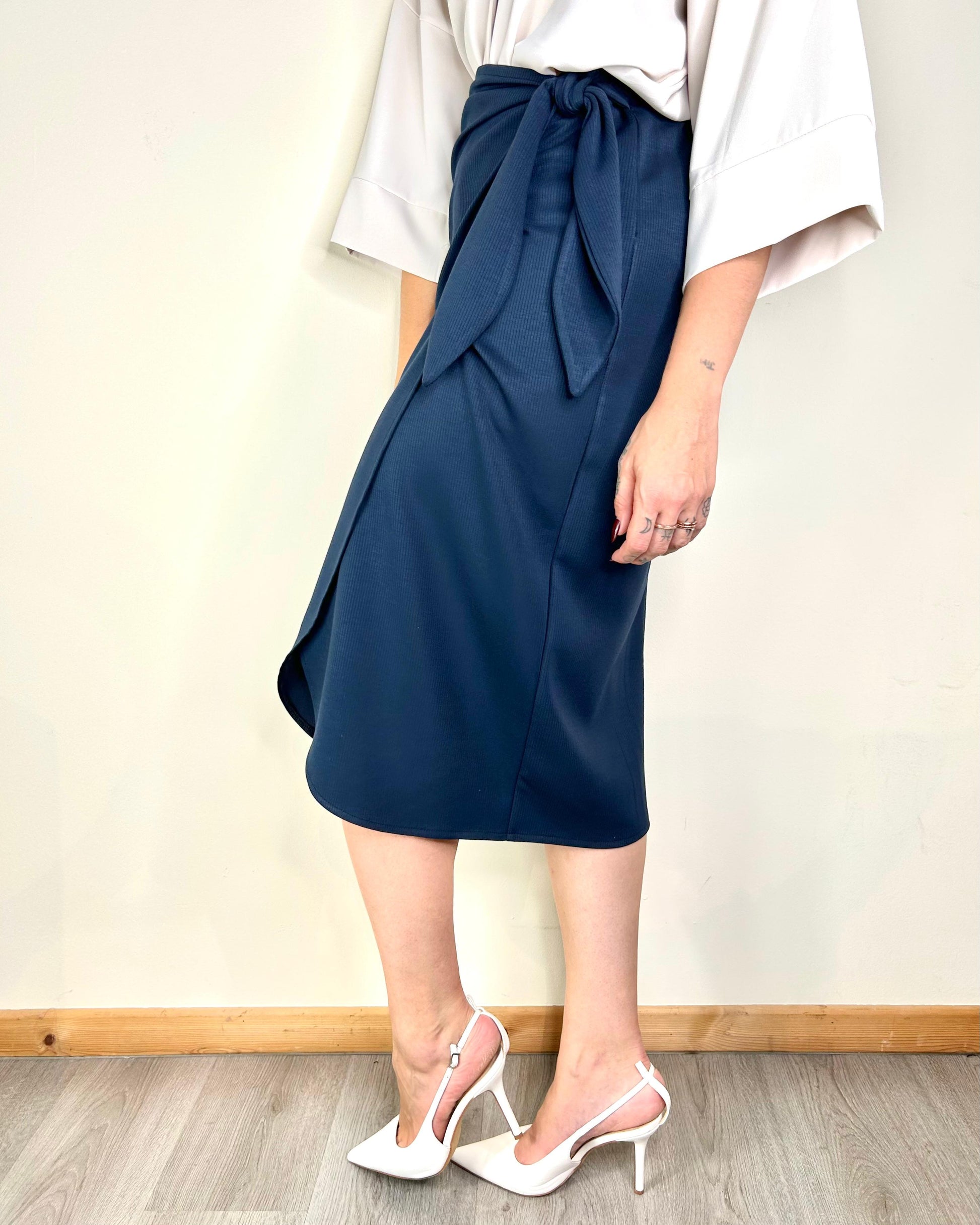 Gonna midi a portafoglio chiusa con un nodo laterale.