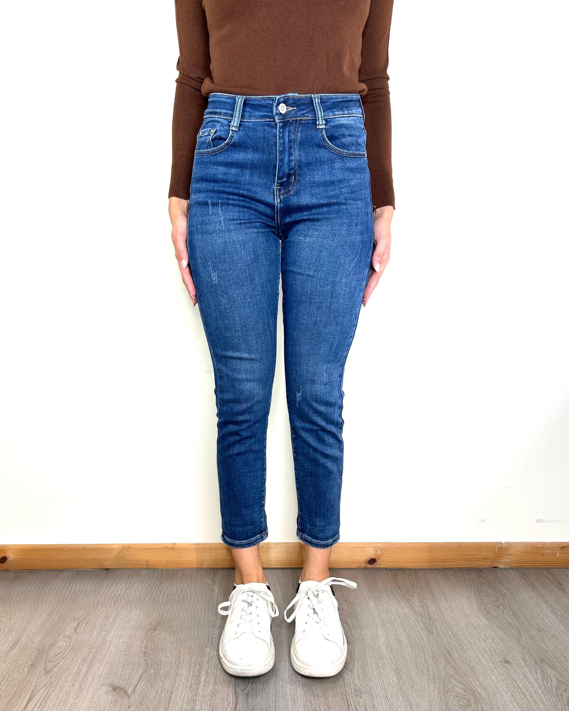 Jeans taglio boyfriend super elasticizzato. Vita alta, veste regular. Essendo molto elasticizzato si consiglia di acquistare una taglia in meno, perchè dopo un lavaggio o due si ammorbidisce.