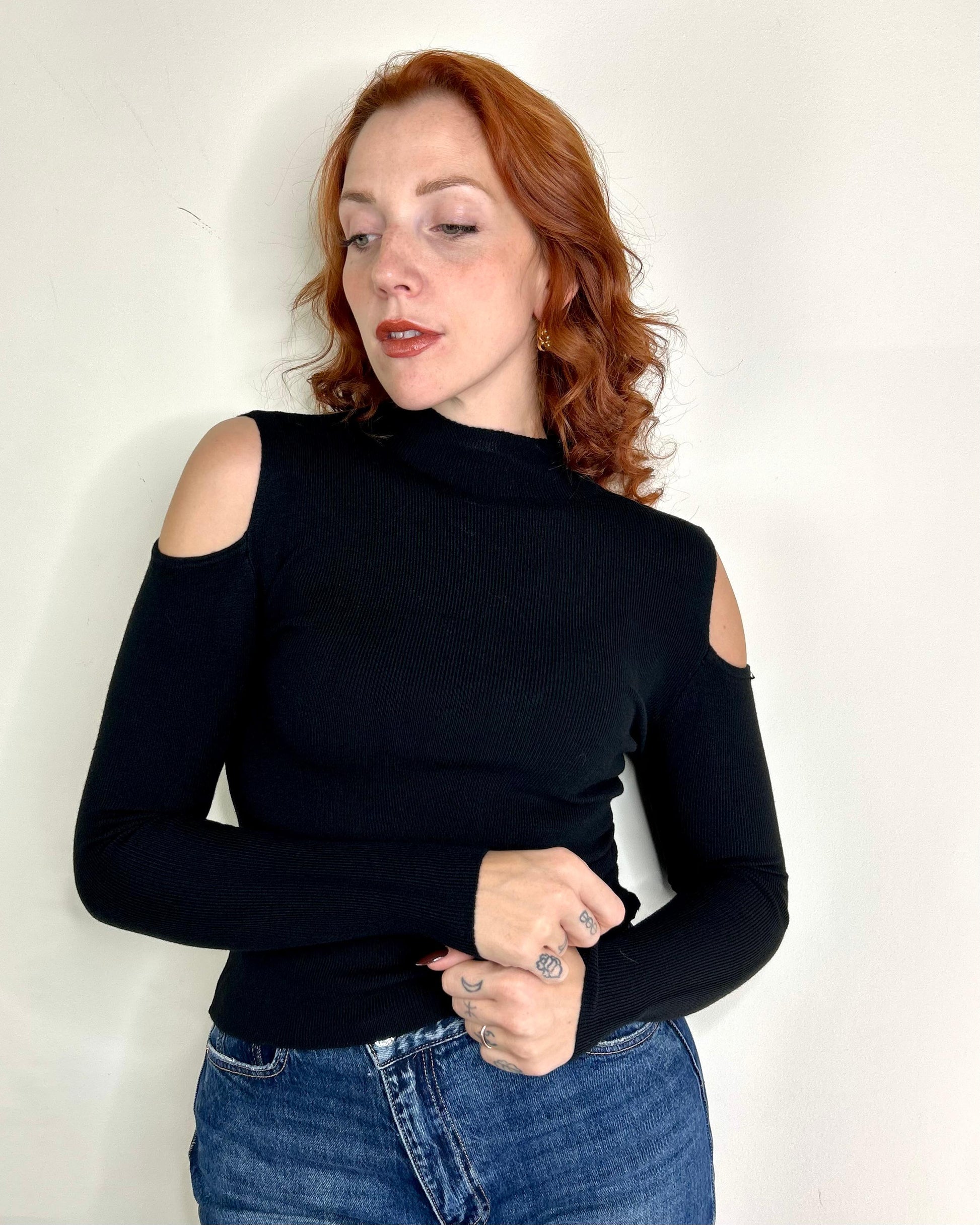 Maglioncino a costine con cut-out sulle spalle e collo alto.