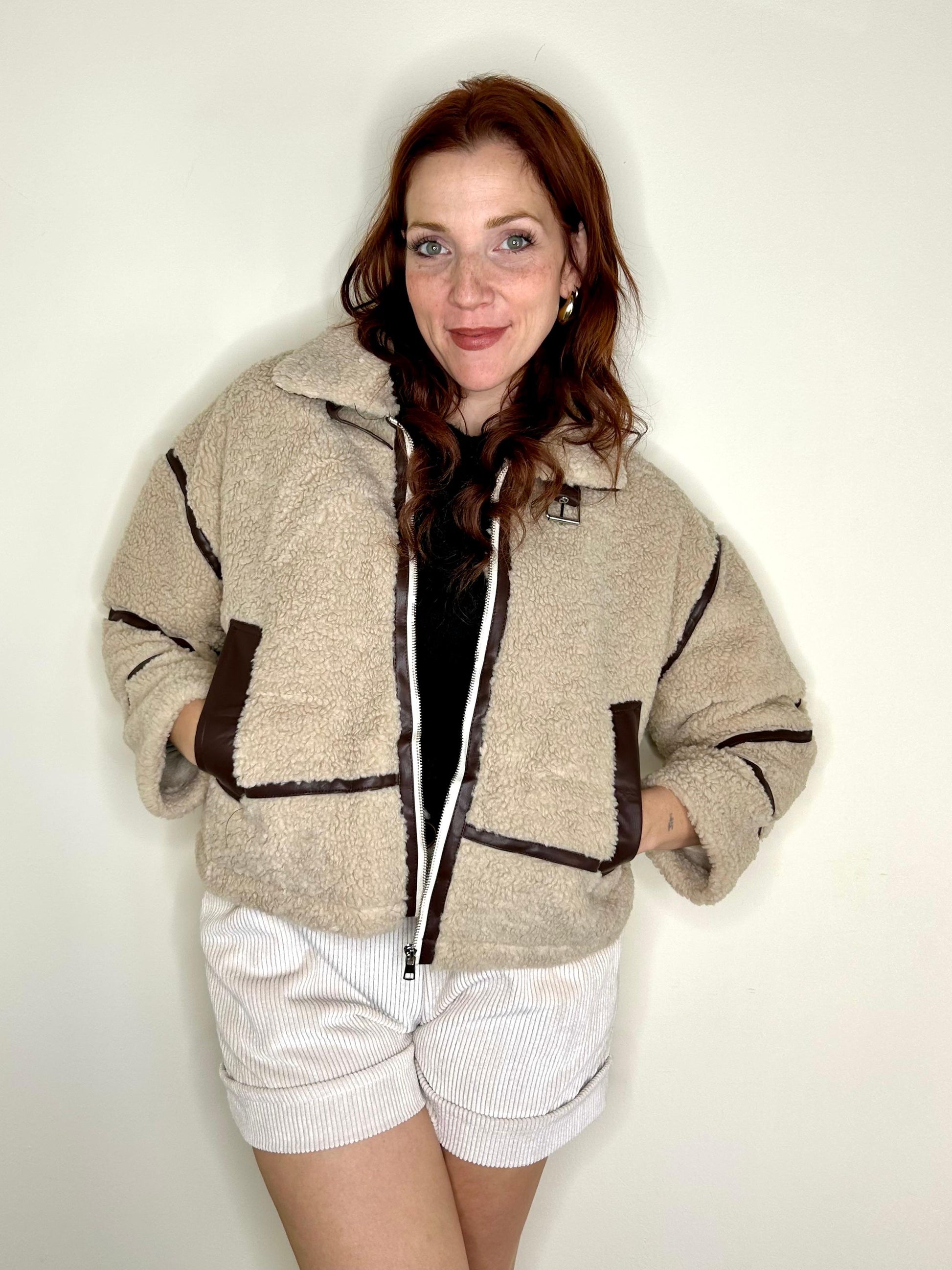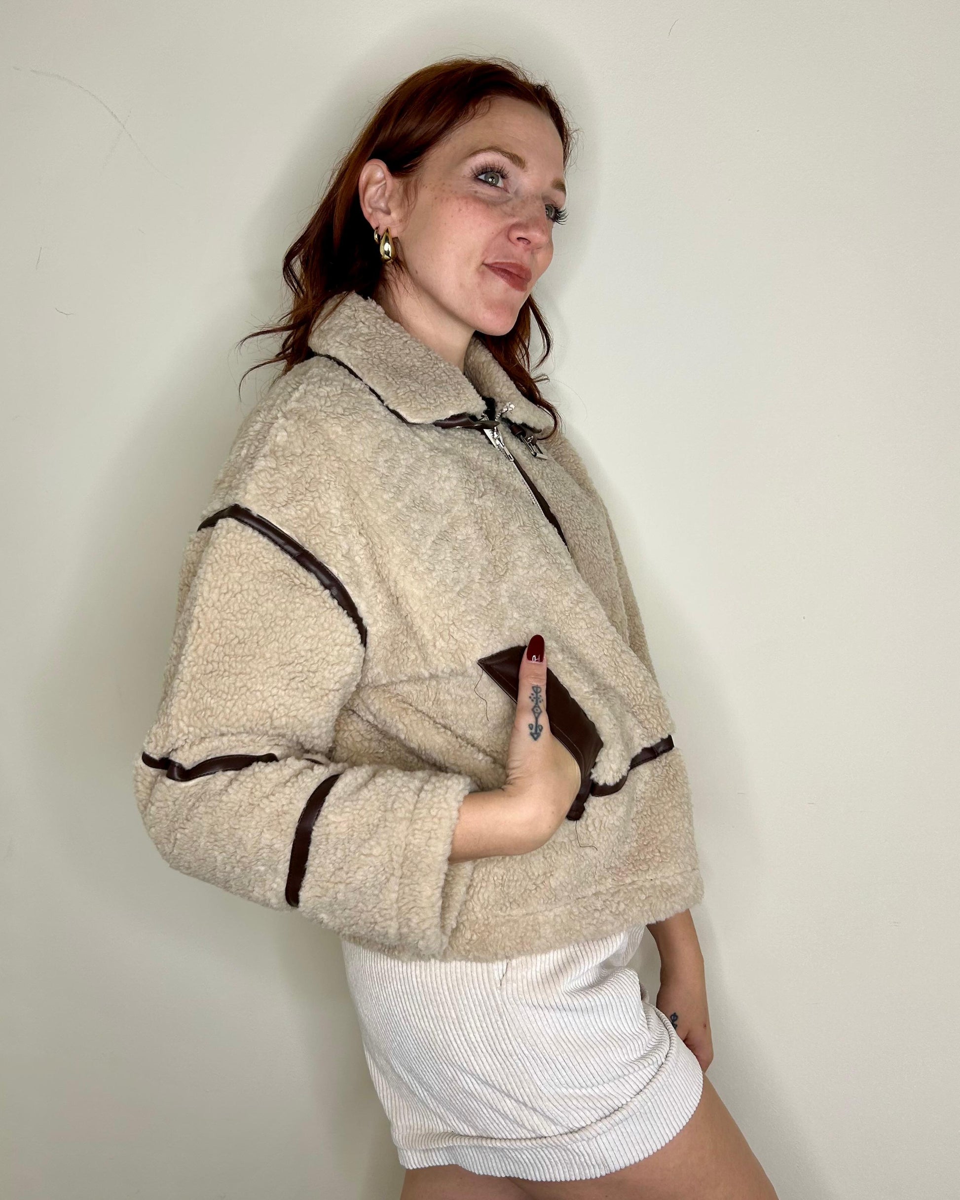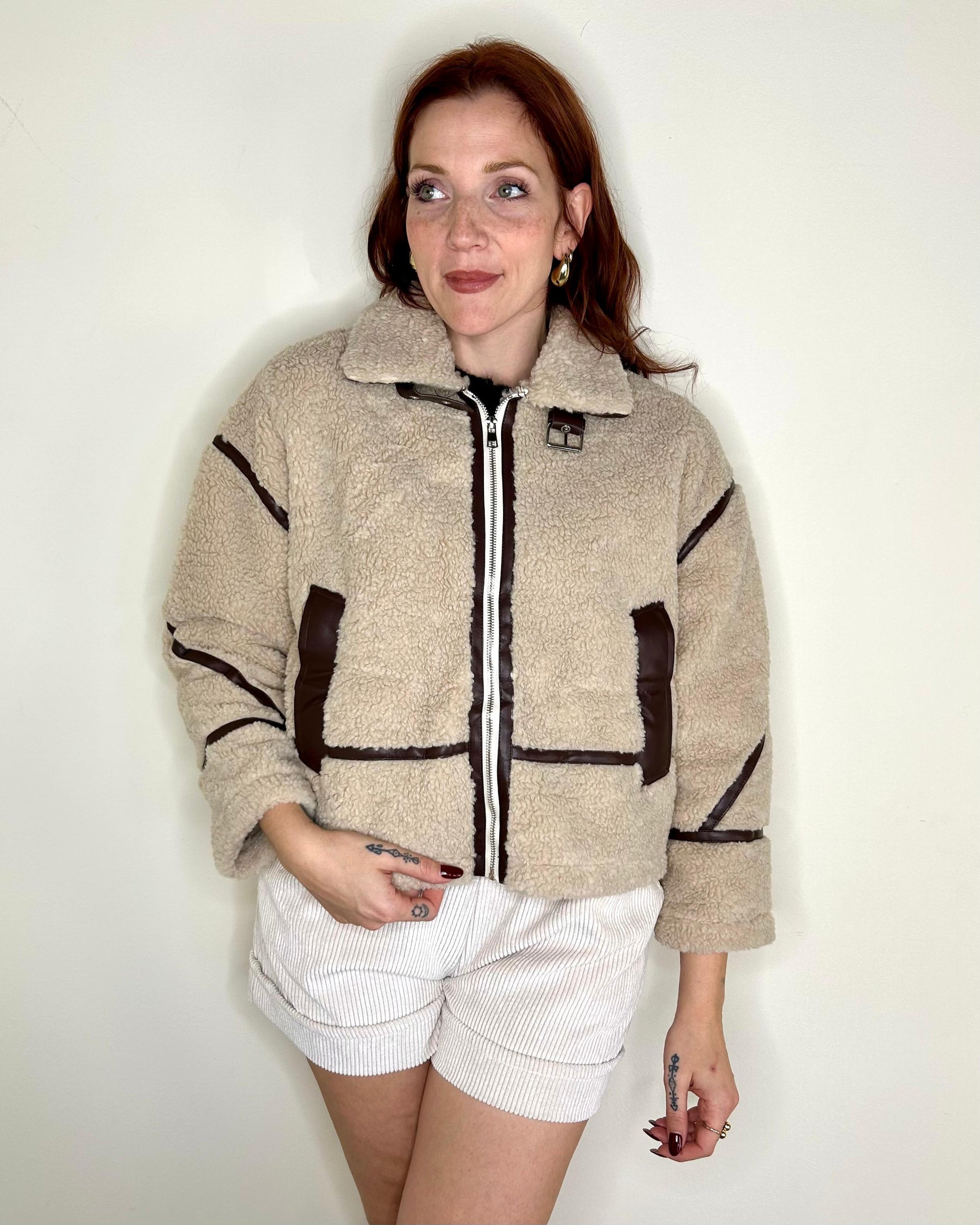 Eco-montone crop effetto teddy, chiusura con zip e finiture in ecopelle.