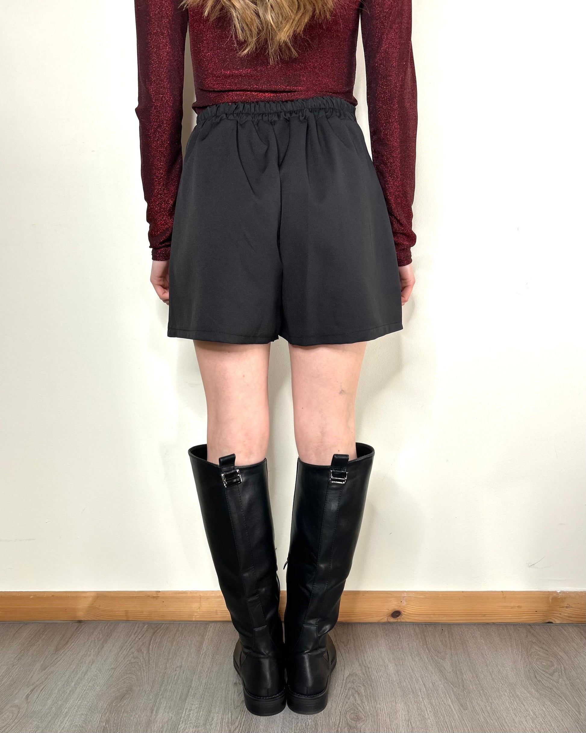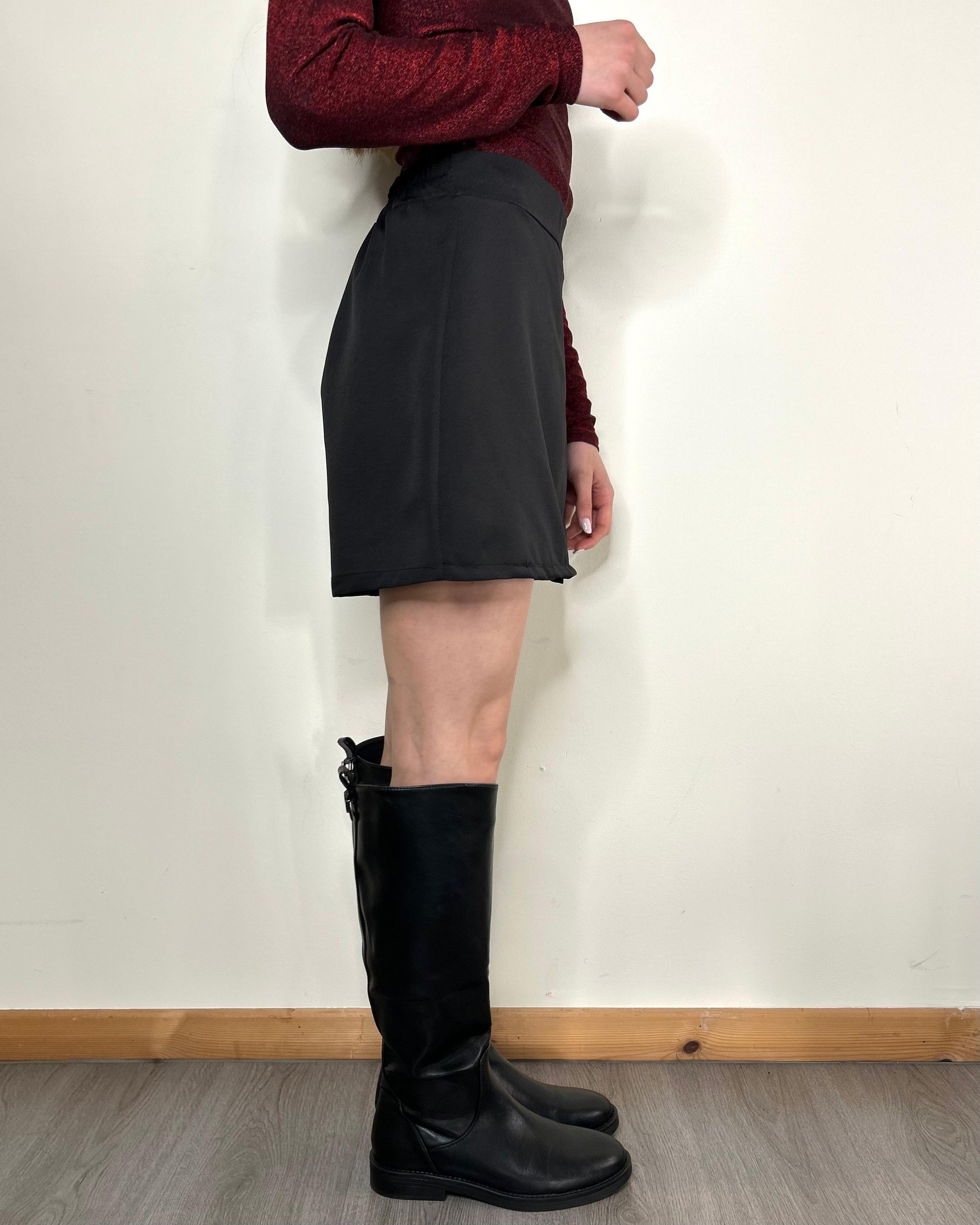 Gonnellina con pantaloncino nascosto (davanti). Elastico in vita solo sul retro, davanti liscio e rigido.