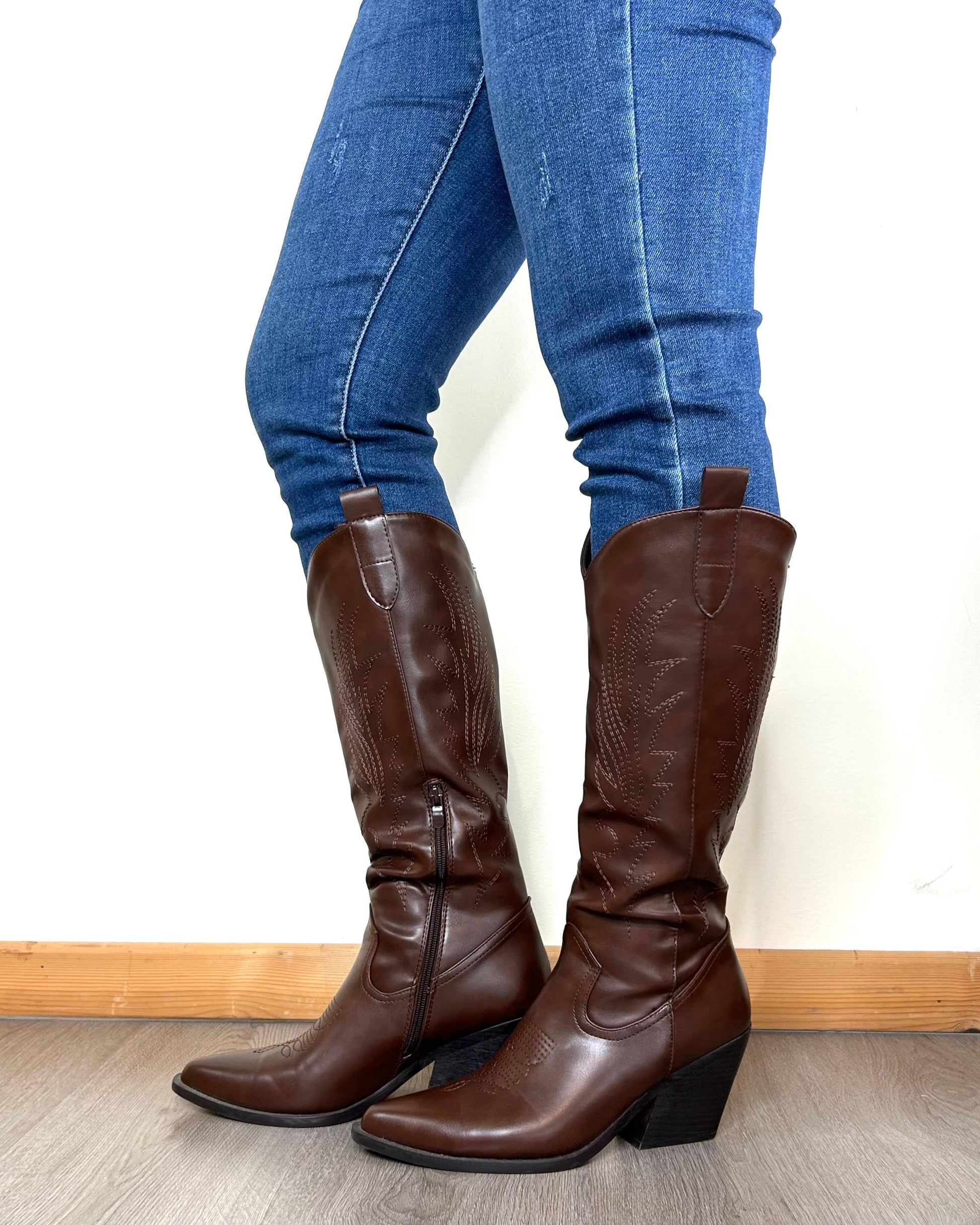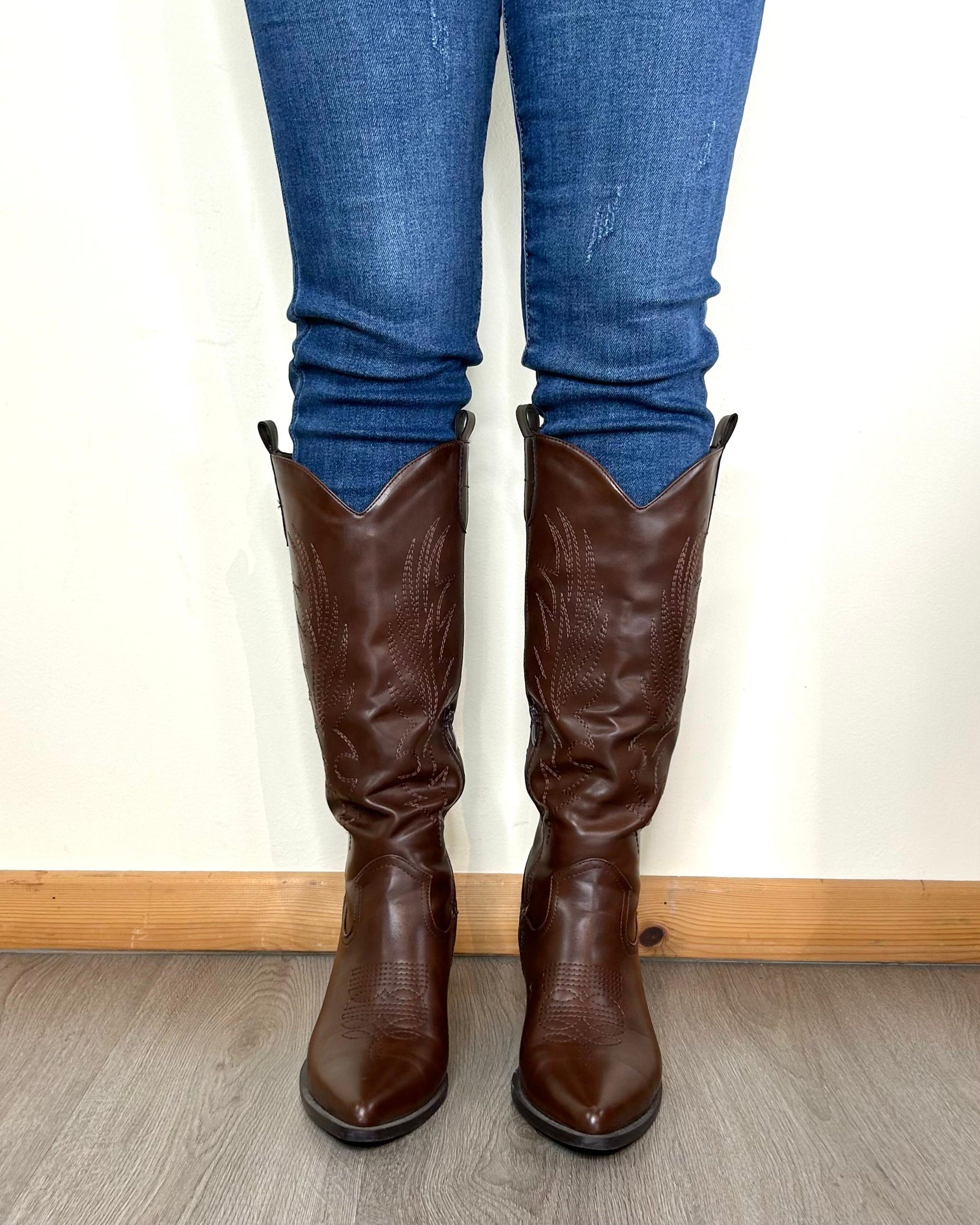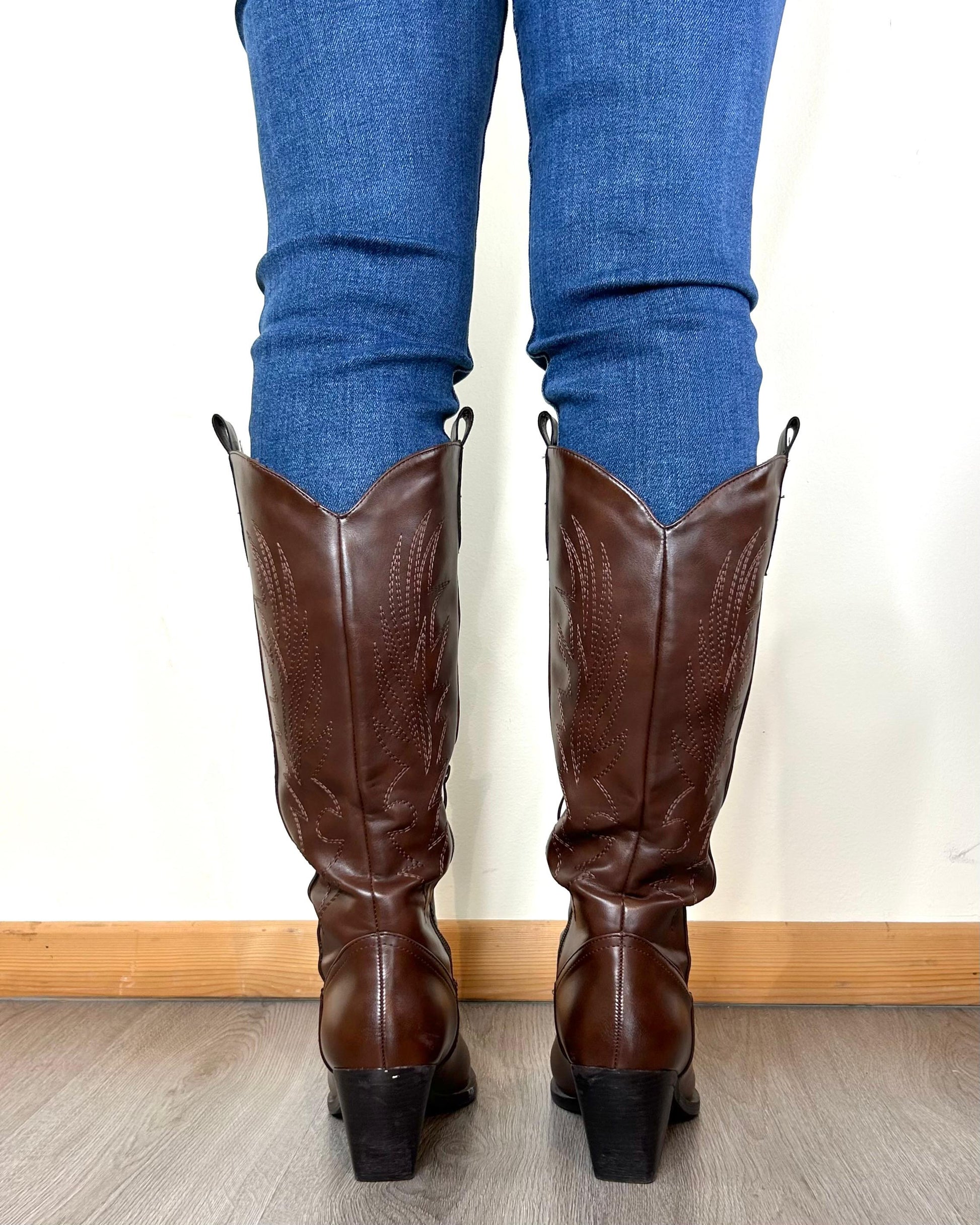 Texano al ginocchio in ecopelle marrone. Cuciture tipiche del taglio camperos e forma tradizionale: taglio a V sul ginocchio e punta sul davanti.