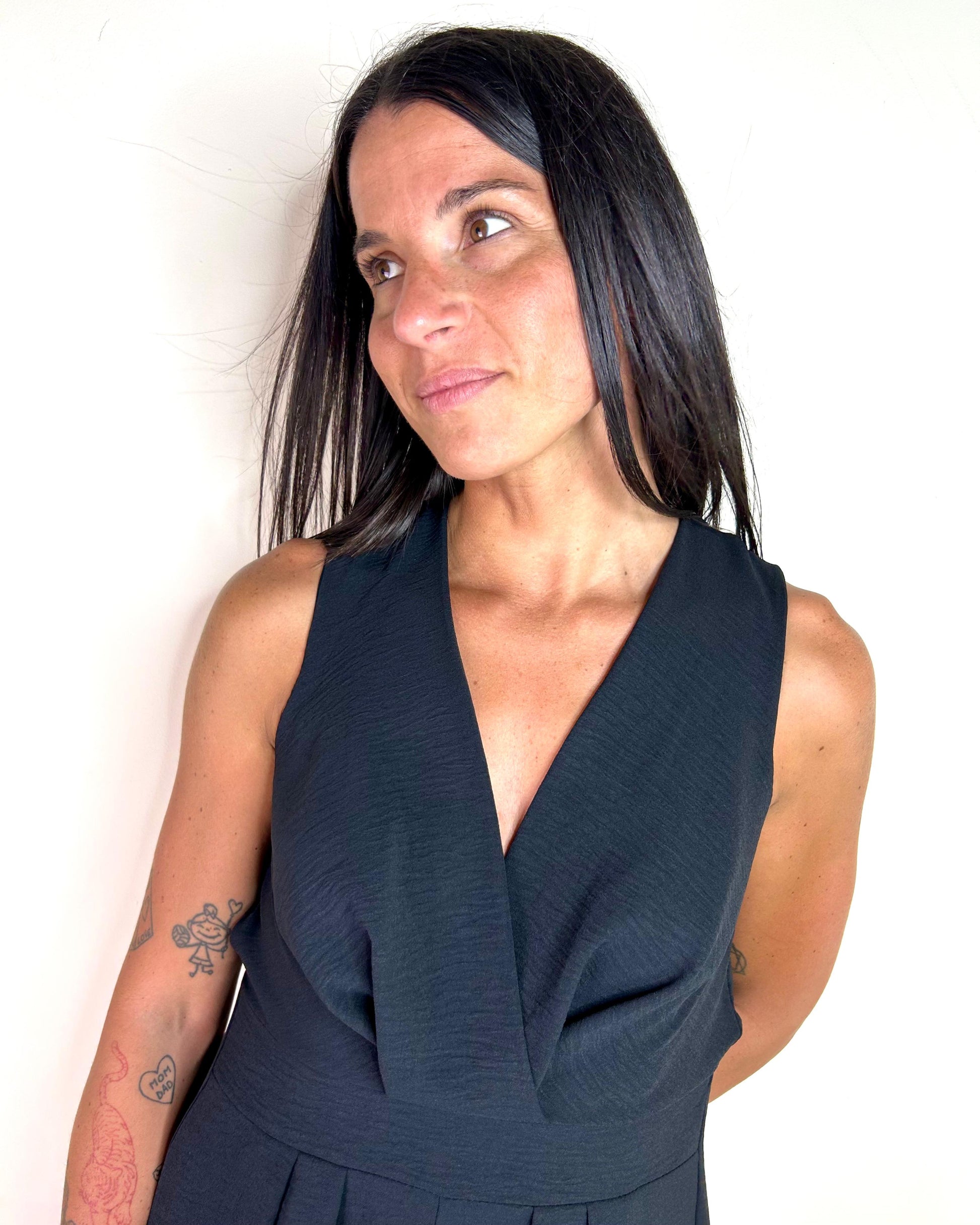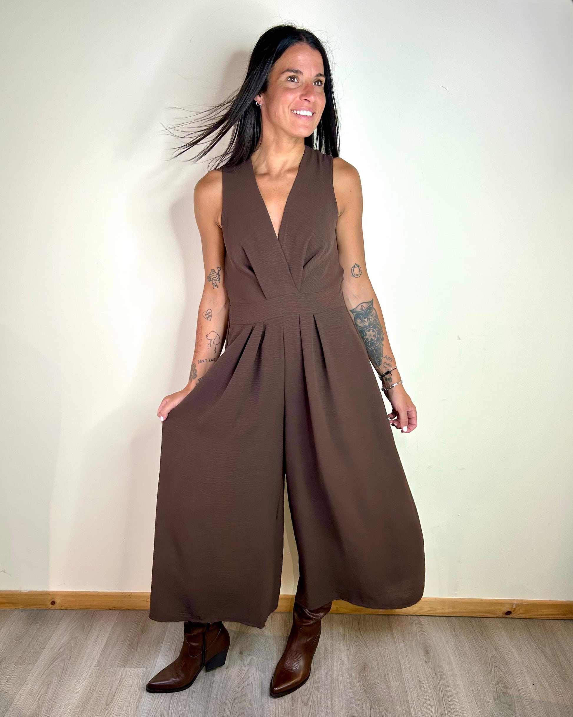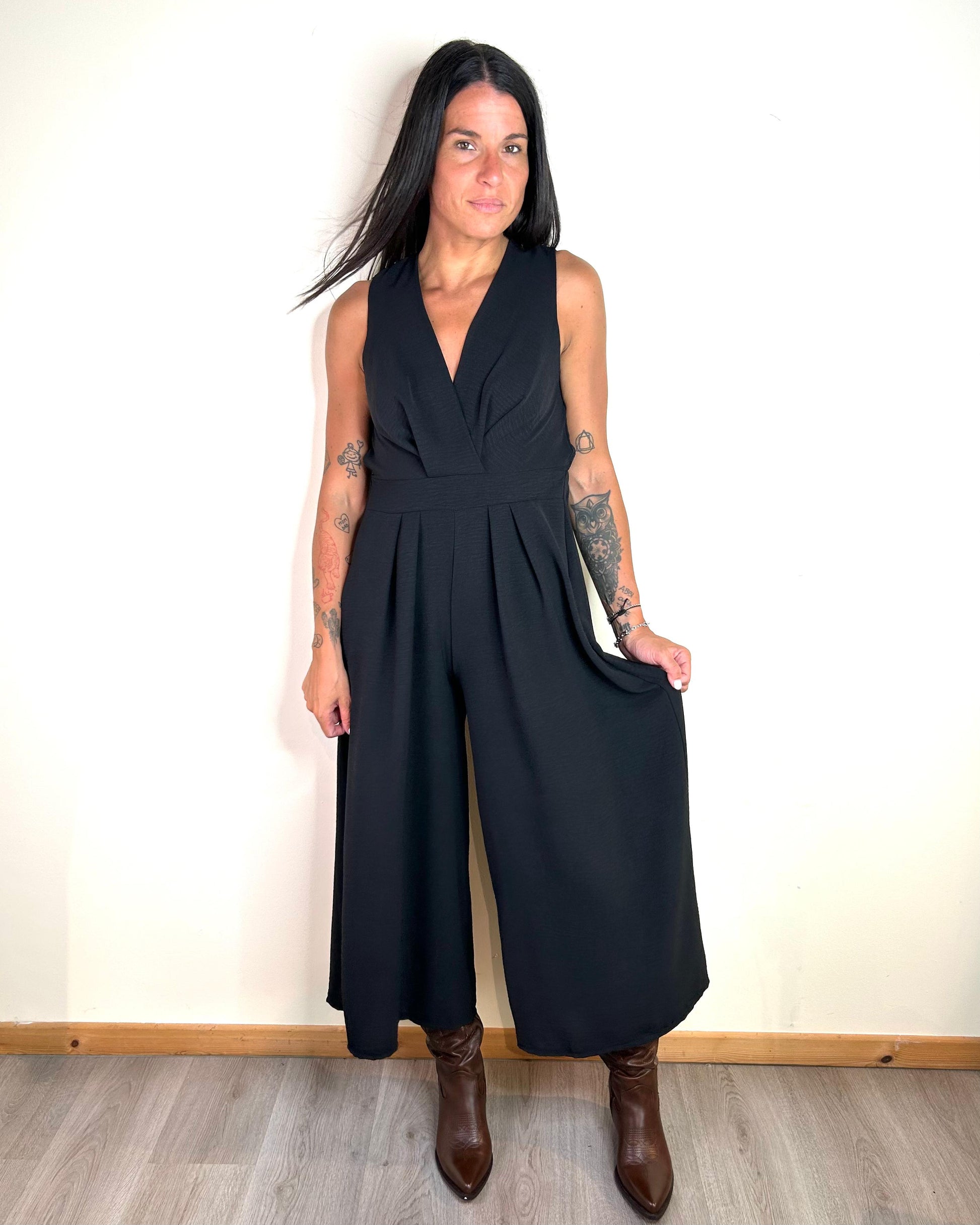 Tuta intera in tessuto fresco con pantalone a palazzo e scollo incrociato a V sul davanti.