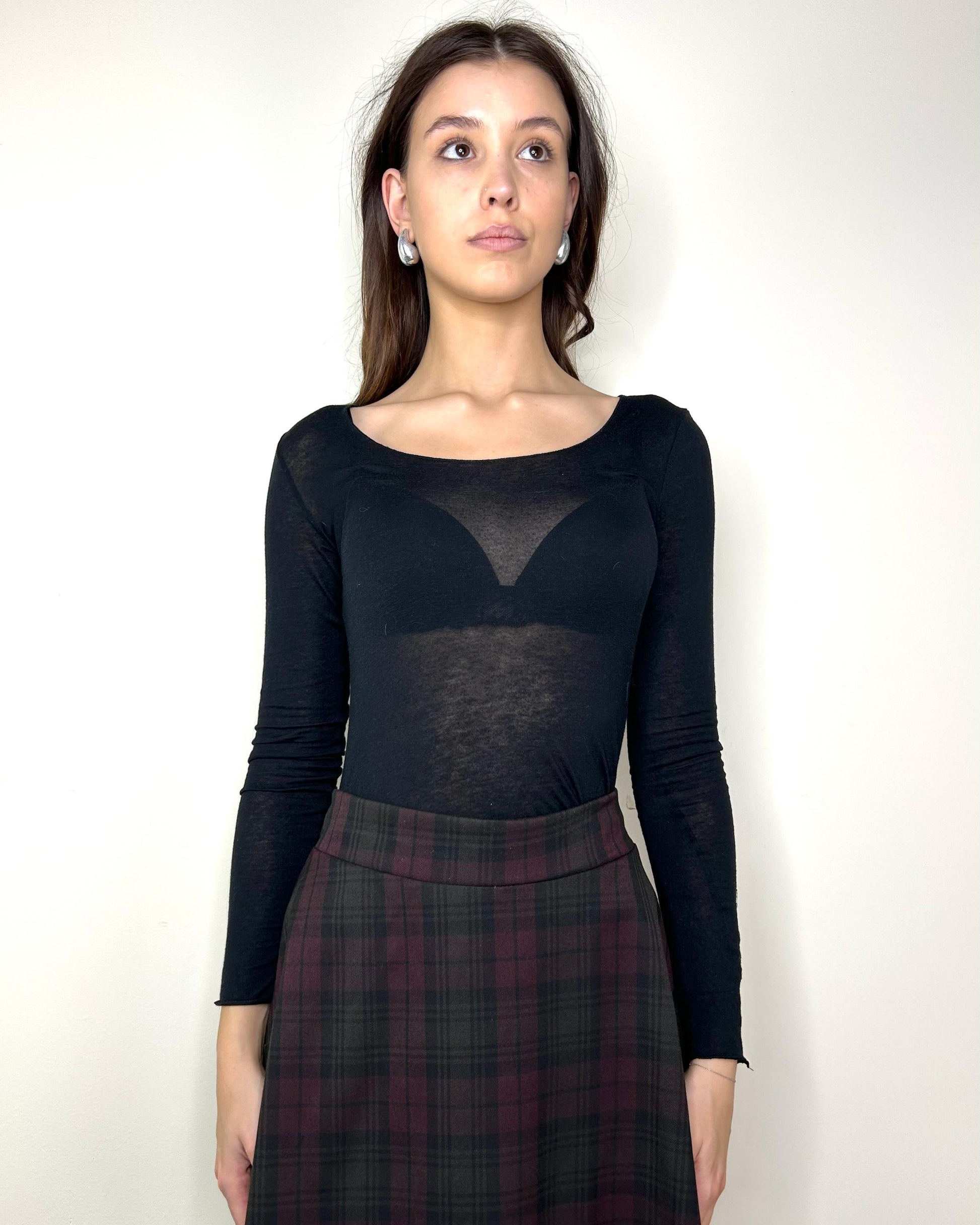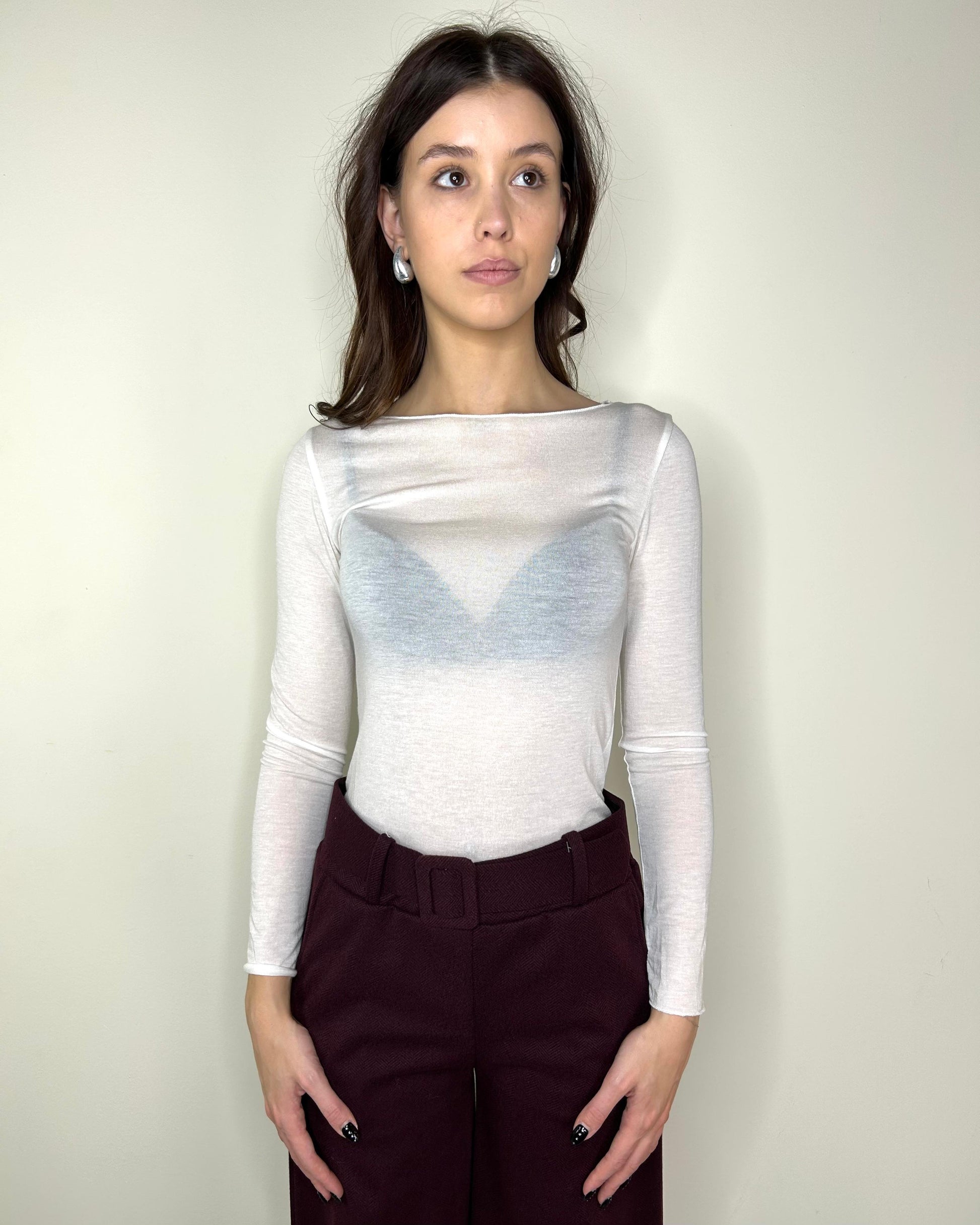 Maglia basica in misto viscosa e cashmere a girocollo, leggermente trasparente.